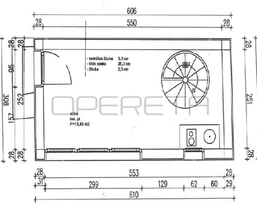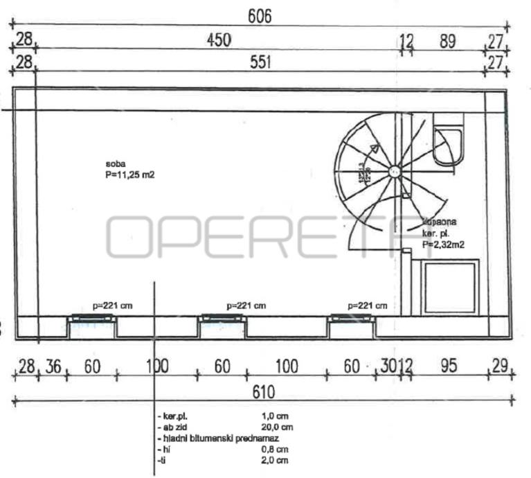 Građena je 1995. g. te ima urednu dokumentaciju. Sastoji se od podrumskog ( 15 m2 ) i prizemnog dijela ( 15m2 ) koji su povezani spiralnim stepenicama. Kući je potrebno uređenje. Moguća namjena kao poslovnog prostora.