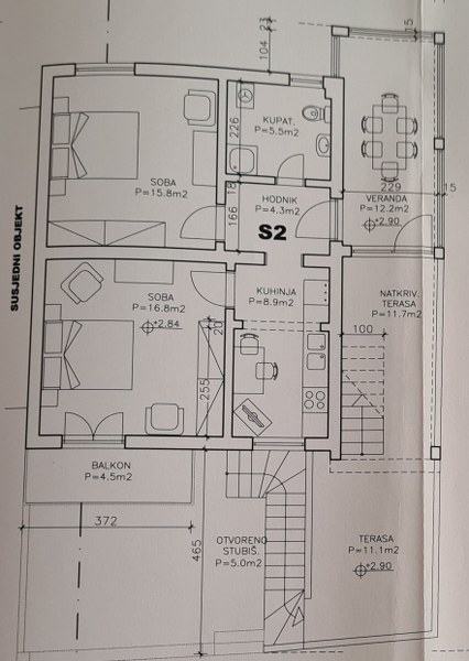 Drugi kat također povezan vanjskim stepeništem sastoji se od verande, dvije spavaće sobe, kuhinje sa blagovaonicom, kupaonice i ostave.