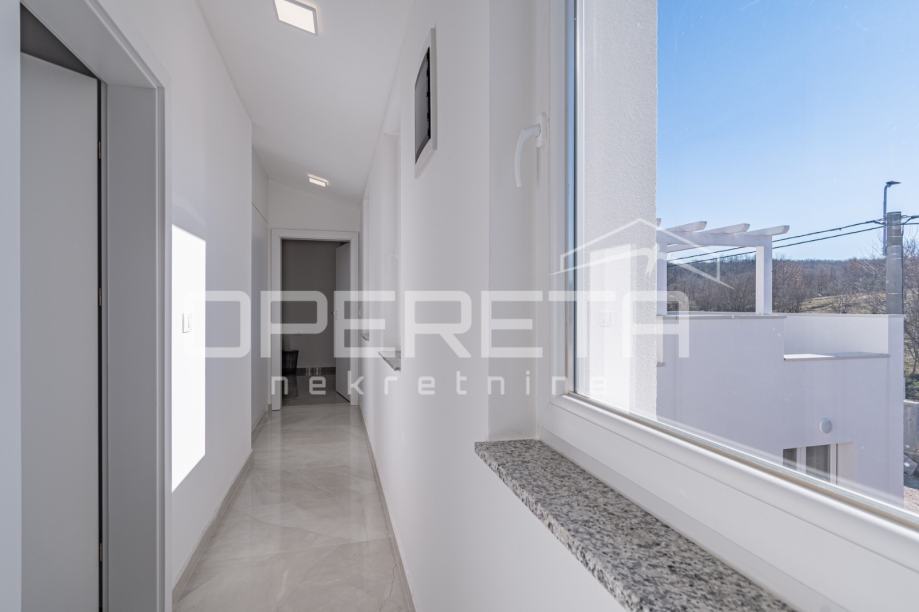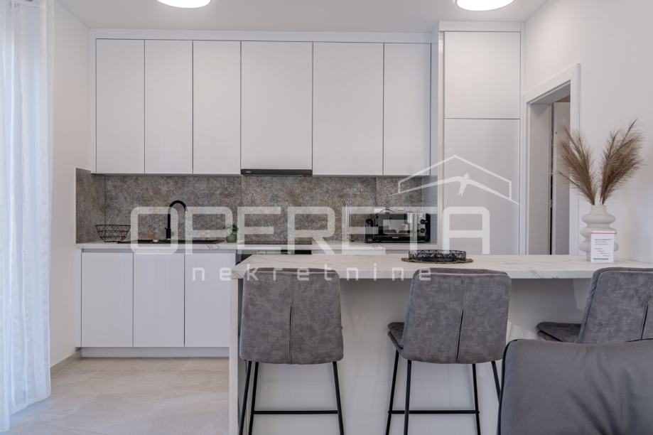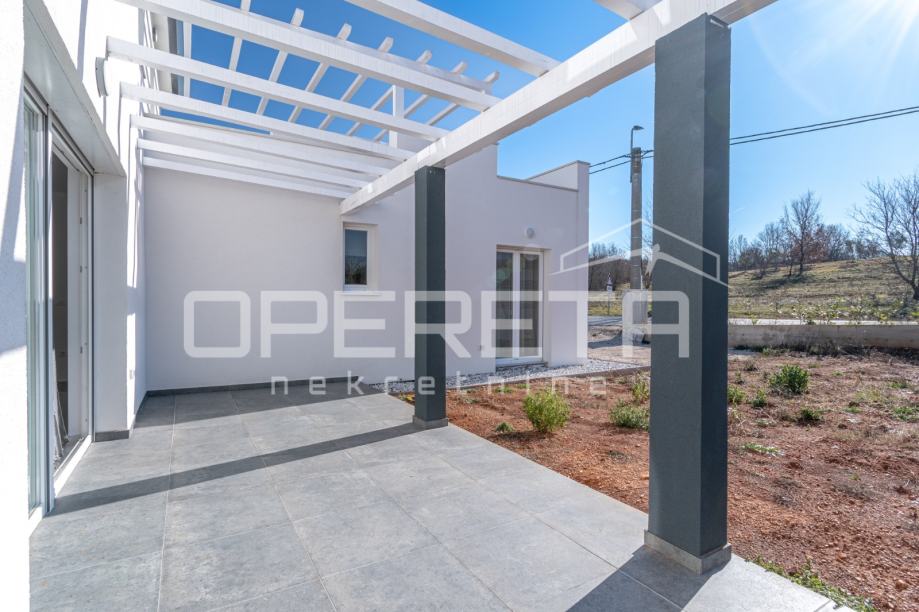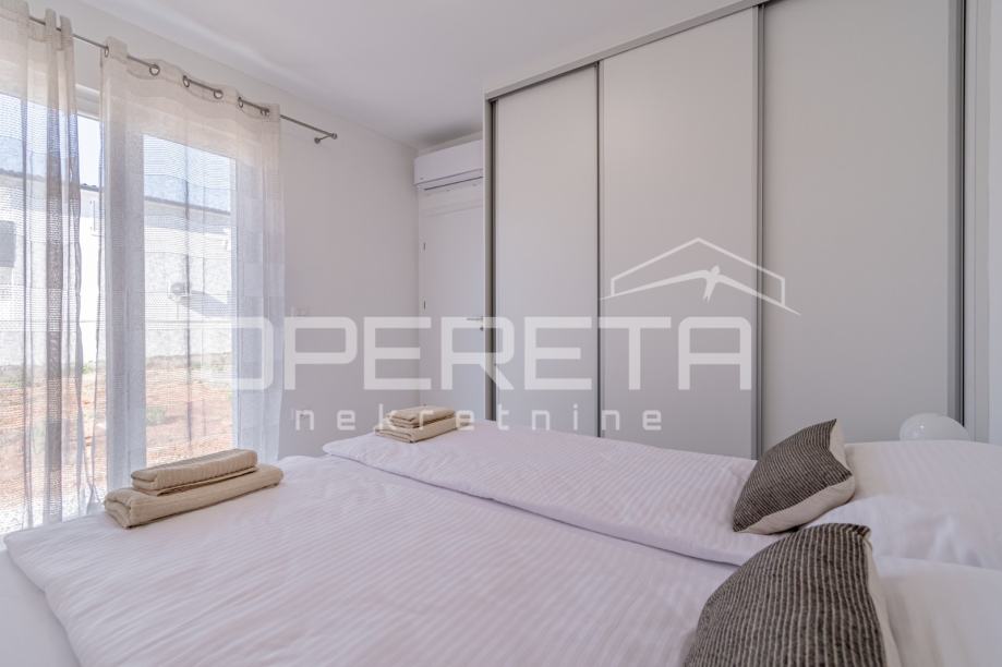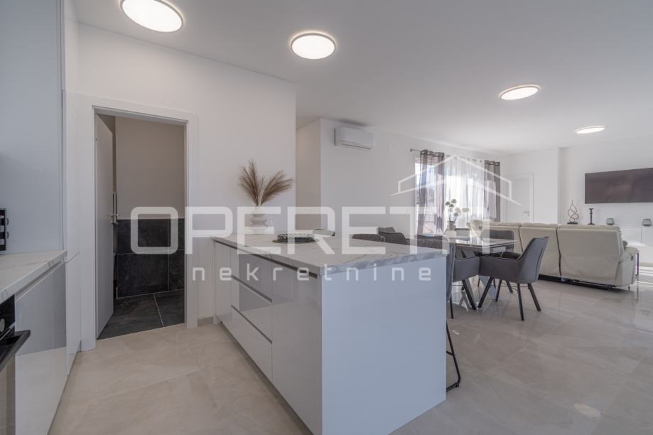 U prizemlju se nalazi prostrani dnevni boravak, moderna kuhinja s otokom i vrhunskim aparatima povezana je s blagovaonicom, stvarajući idealan prostor za druženje s obitelji i prijateljima. Iz dnevnog boravka izlazi se na natkrivenu terasu, gdje se možete opustiti i uživati u svježem zraku. Na ovoj etaži se također nalazi spavaća soba s vlastitom kupaonicom, idealna za goste ili kao radna soba, te praktična ostava.
