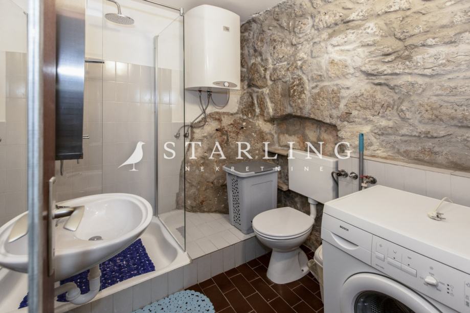 Prizemlje ove kuće prostire se u otvorenom konceptu kuhinje, blagovaonice i dnevnog boravka. Unutarnje stepenice vode na kat gdje se nalazi spavaća soba i kupaonica, smještena uz prirodne kamenite stijene, što prostoru daje rustikalni ugođaj. S ovog kata izlazi se na natkrivenu terasu koja pruža miran pogled na zelenilo okoline.