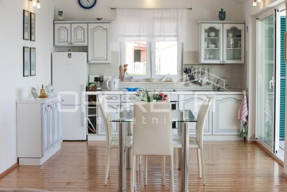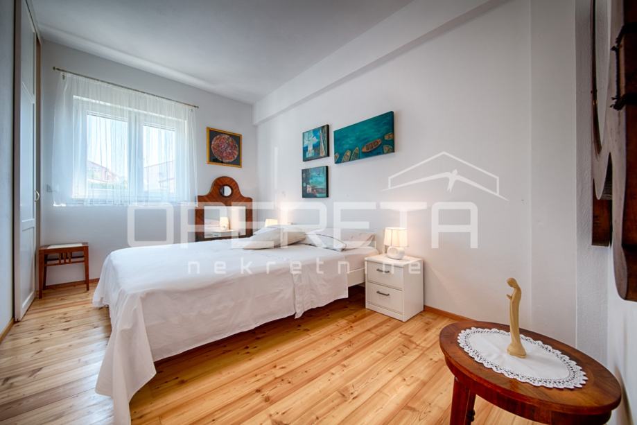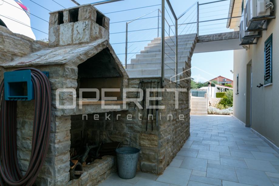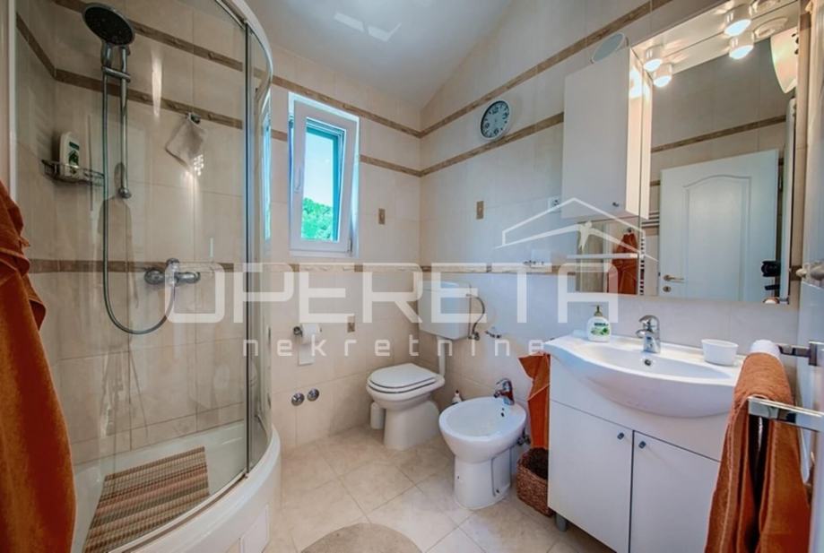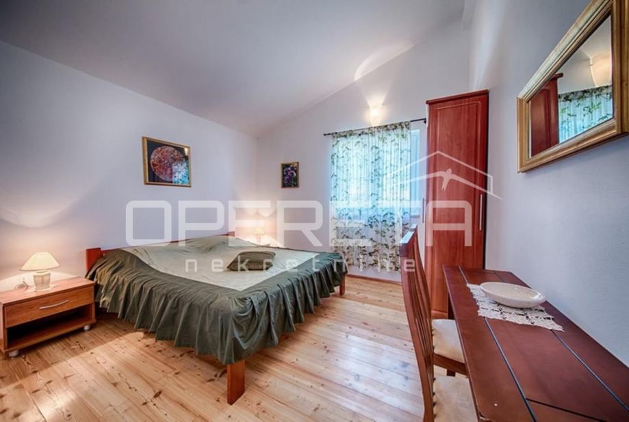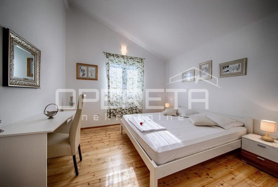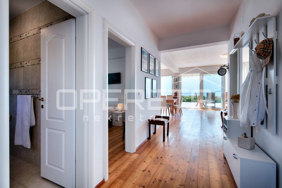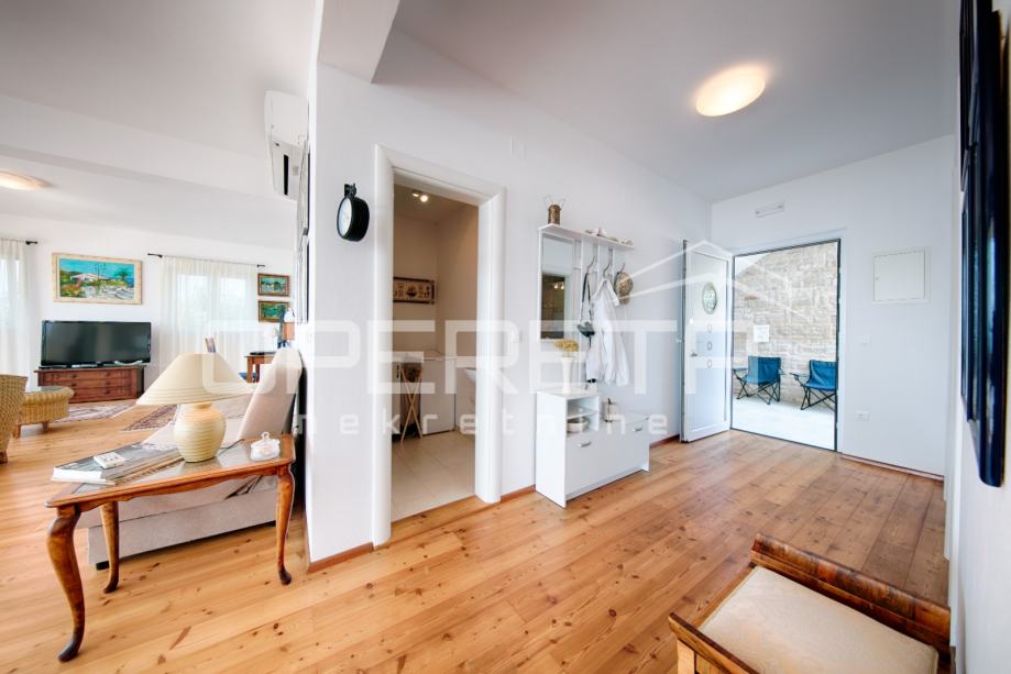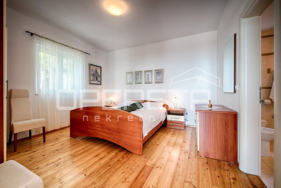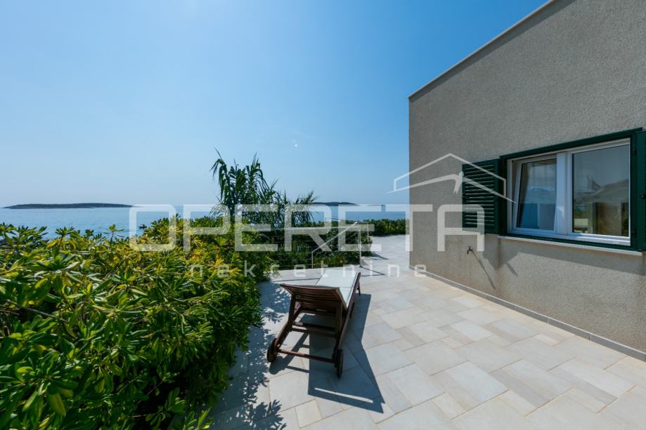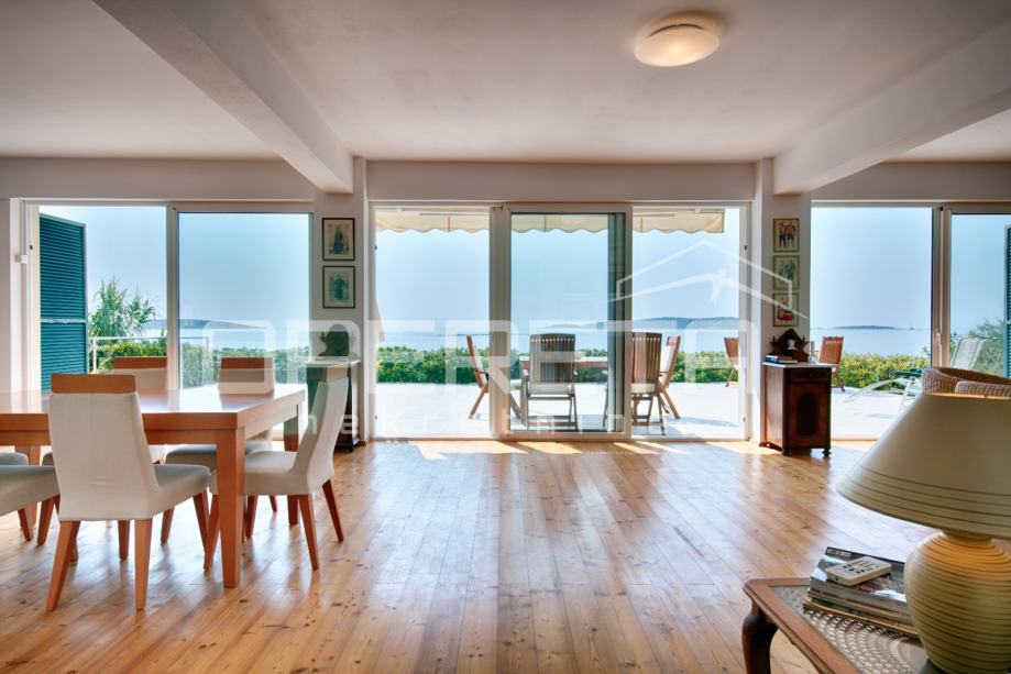 Jedinstvena vila s pogledom na more, na dvije etaže sa raskošnom okućnicom koncipirana kao dva stana sa terasama. Svaki stan ima dvije spavaće sobe s kupaonicama s tušem, potpuno opremljene kuhinje, dnevnog boravka s blagovaonicom i prostranim slikovitim pogledom na more.