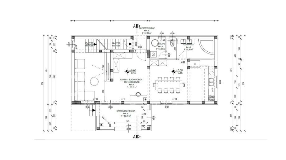 Prizemlje čini dnevni boravak, blagovaonica, kuhinja i hodnik ukupne površine 62 m2, kupaonica sa jacuzzi kadom površine 9 m2, te praonica/spremište površine 3 m2. Iz blagovaonice i dnevnog boravka izlazi se na natkrivenu terasu površine 11 m2 koja je okružena vrtom.