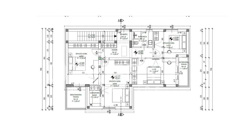 Na katu su smještene ukupno četiri spavaće sobe površina 12 m2, 18 m2, master soba s garderobom ukupne površine 21 m2 koja izlazi na natkrivenu terasu površine 5 m2, te spavaća soba površine 16 m2 koja također izlazi na terasu površine 3 m2. Na katu je dodatna kupaonica površine 4 m2, te hodnik površine 9 m2.