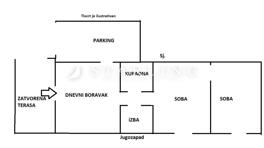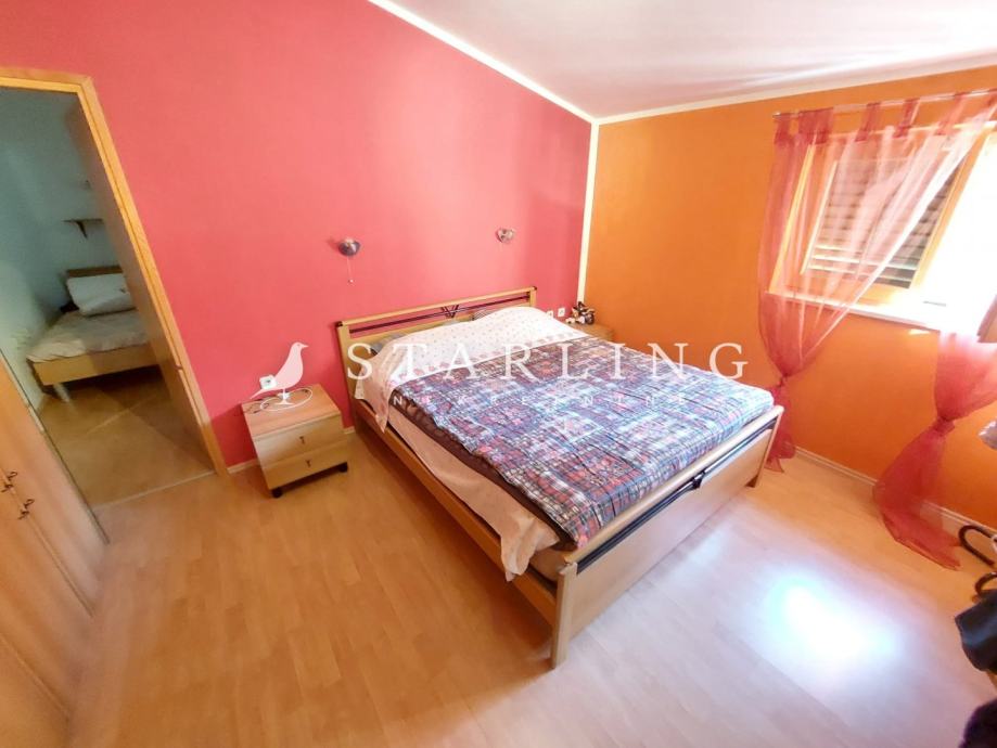 Kuća je prizemnica i sastoji se od dnevnog boravka s kaminom, dvije spavaće sobe, kupaone, spremišta, zatvorene terase i natkrivenog parkirnog mjesta.
