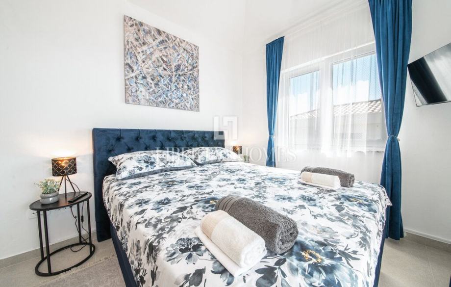 Kuća se prostire na dvije etaže. U prizemlju se nalazi spavaća soba s vlastitom kupaonicom, dodatni toalet, ostava, potpuno opremljena kuhinja s blagovaonicom te prostrani dnevni boravak s izlazom na uređenu okućnicu. Na katu su smještene dvije elegantne spavaće sobe, svaka s vlastitom kupaonicom i izlazom na natkrivenu terasu s koje se pruža pogled na more.