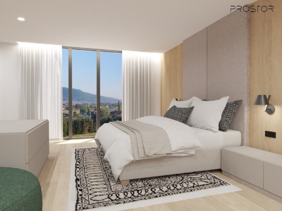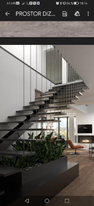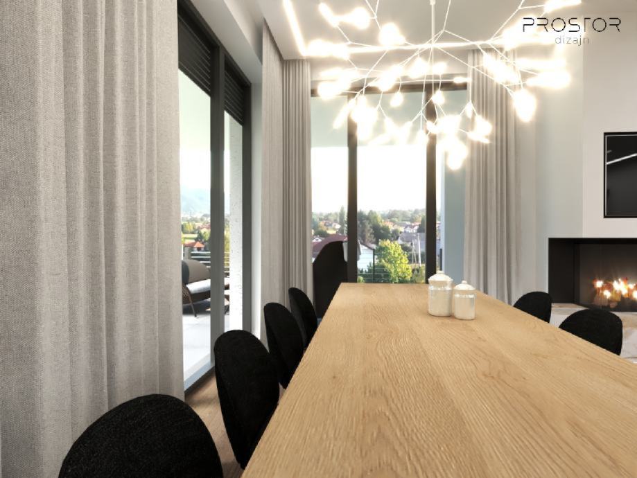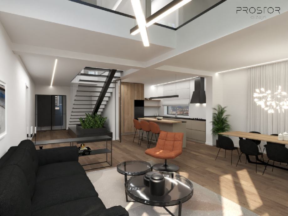 U dnevnom boravku se nalazi otvorena galerija gdje se nalaze staklene stijene visine 580cm iz kojih se pruža prekrasan pogled na Samoborsko gorje, Samobor, Zaprešić. Iz dnevnog boravka se izlazi na prostranu terasu od 35m2. Ukupna površina prizemlja, bez terase i garaže iznosi 135m2.