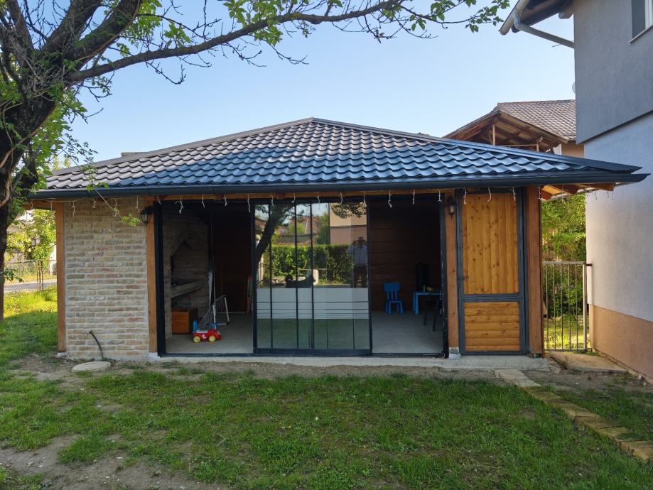 Posjeduje garažu sa spremištem , i novo uređenu dvorišnu prostoriju sa tradicionalnom pecanom, za druženje i opuštanje.