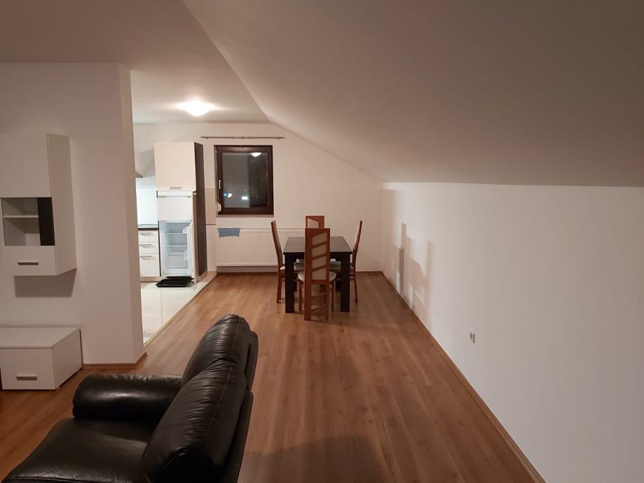 Gornja etaža 75 m2 sastoji se od: ulaz,hodnik, kupaonica s WC,dnevni boravak s otvorenom kuhinjom i izlazom na balkon,2 spavaće sobe.