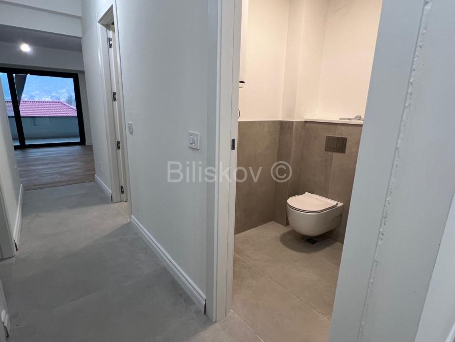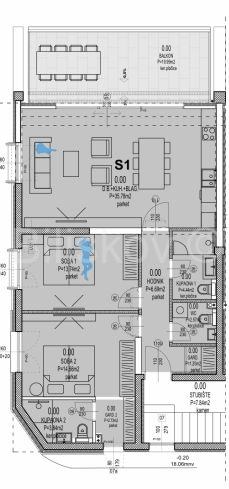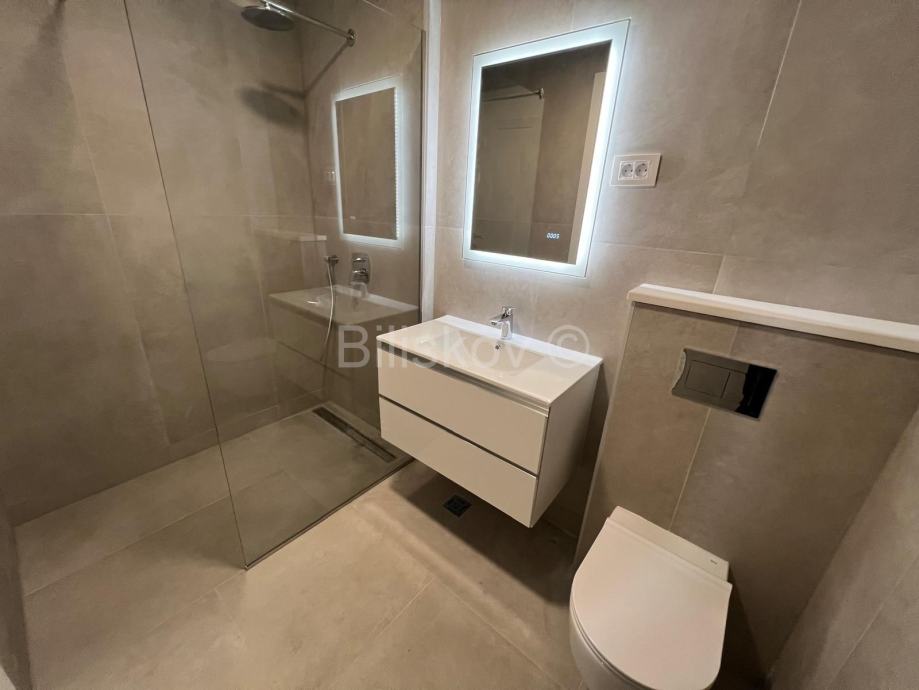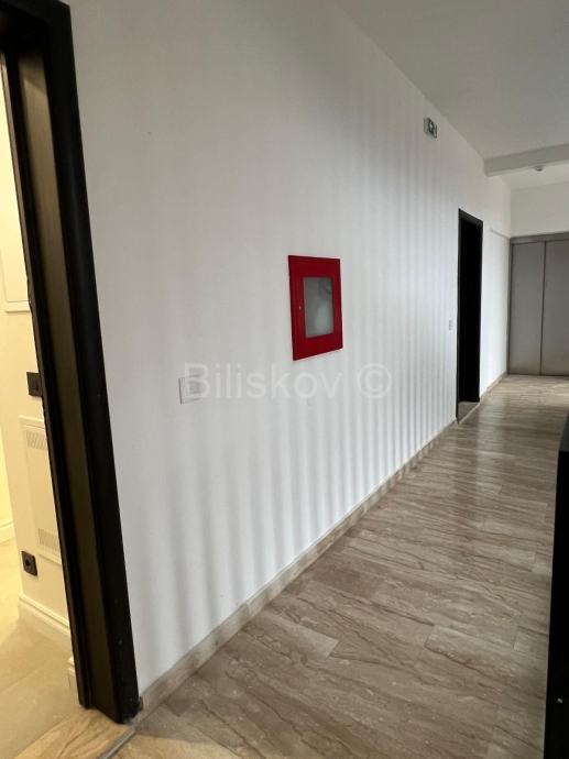 Prekrasan komforan trosoban stan površine 95,16m2 na 1. katu novogradnje. Zgrada ima dizalo. Sjajno iskorišten prostor sastoji se od: hodnika, dnevnog boravka integriranog sa kuhinjom i blagovaonicom (36m2), dvije spavaće sobe, dvije kupaonice od kojih je jedna „en suite“, dakle povezana sa glavnom spavaćom sobom, gostinski WC, garderobe i velike terase od 20m2.