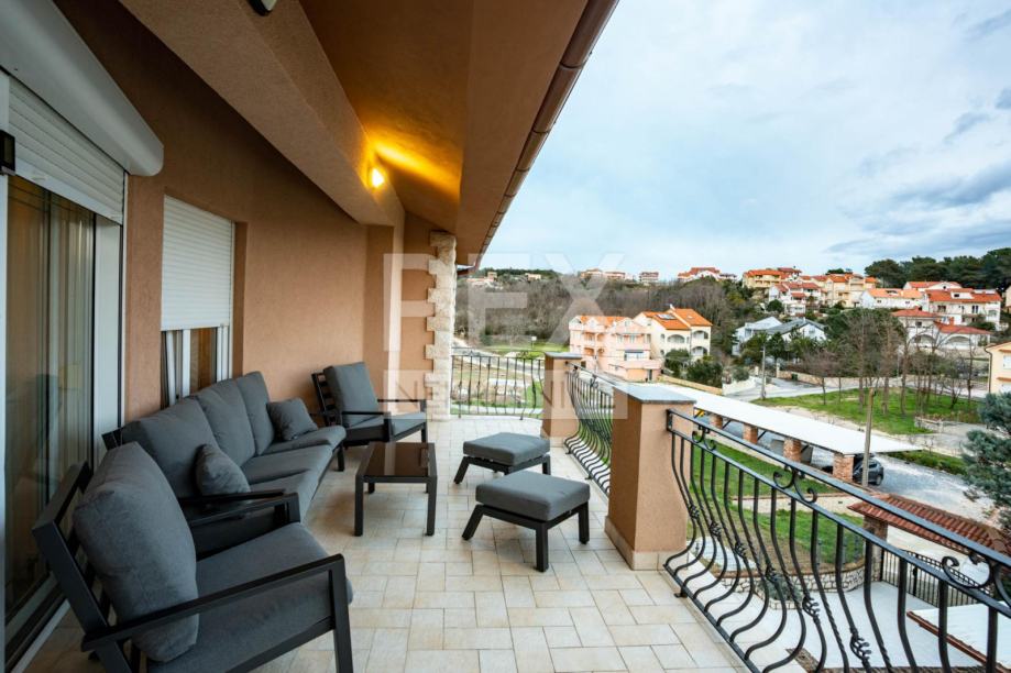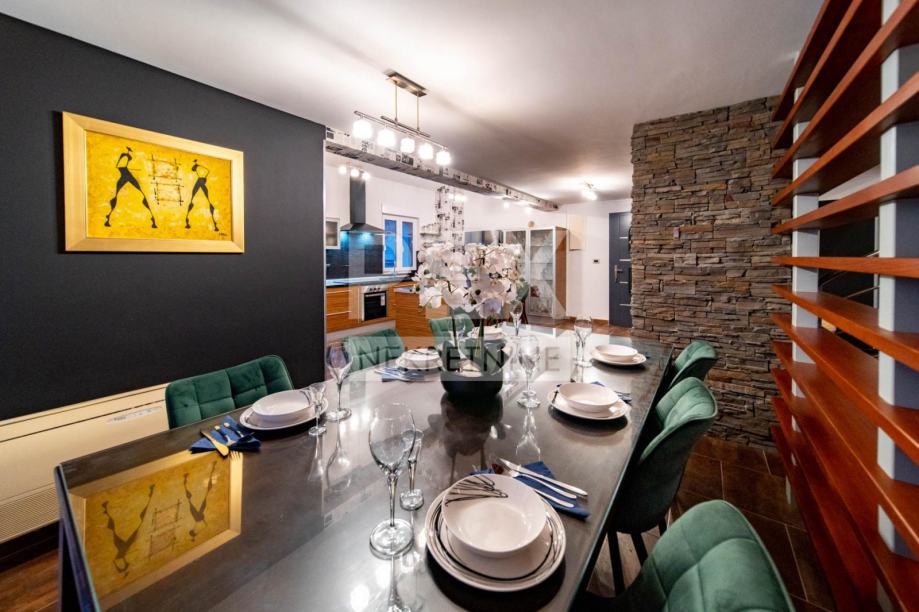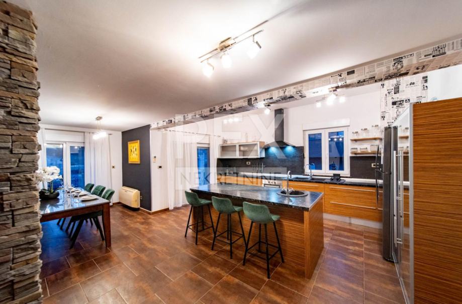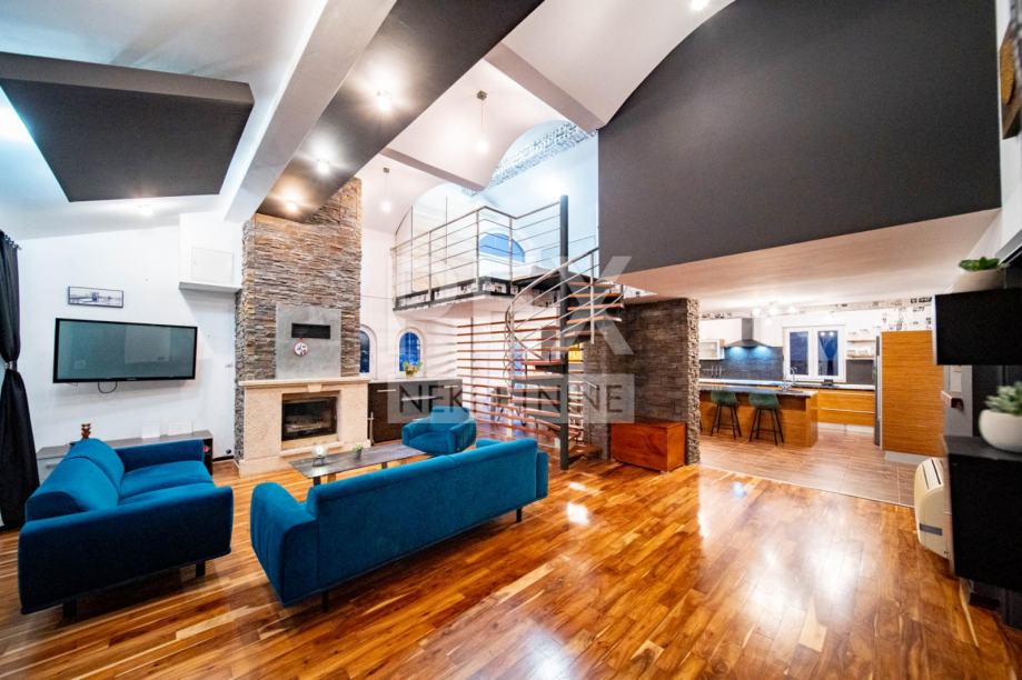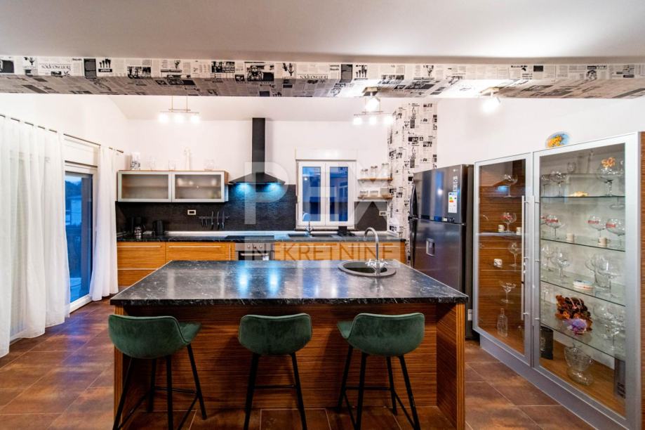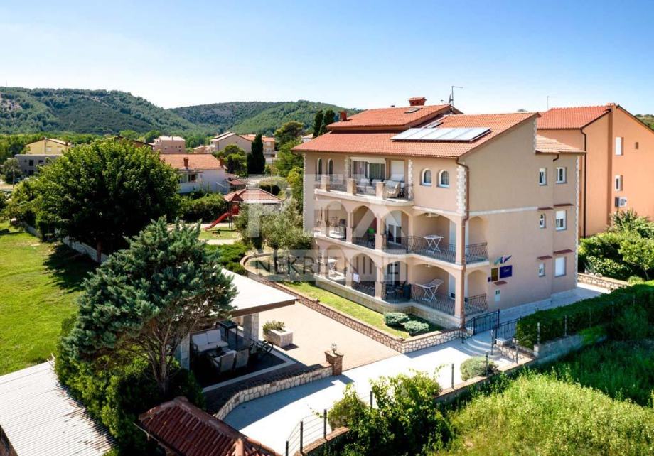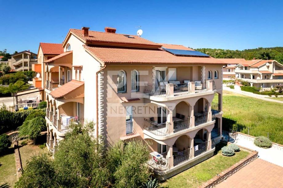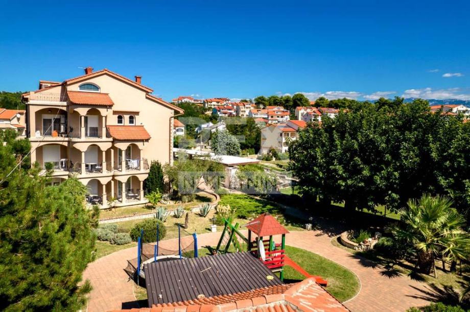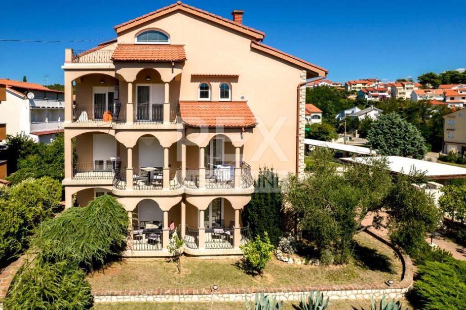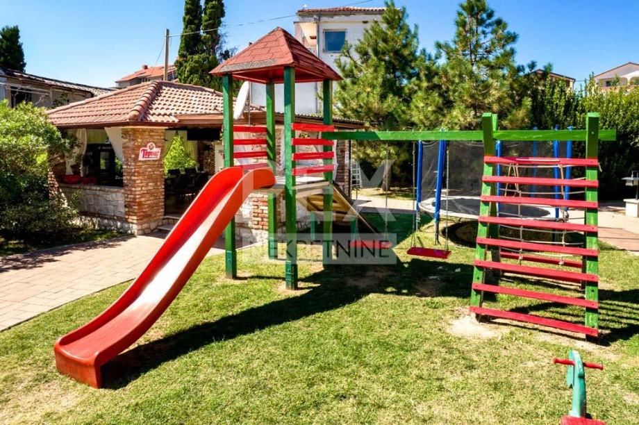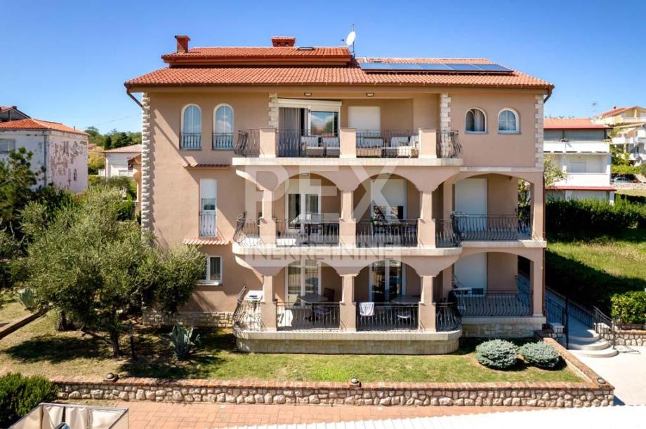 Prodaje se atraktivna kuća na izvrsnoj lokaciji, u neposrednoj blizini mora. Kuća je podijeljena na 7 apartmana: 3 apartmana u prizemlju, 3 apartmana na 1. katu i penthouse s galerijom na 2. katu. Kući pripada 8 natkrivenih parkirnih mjesta. U dvorištu površine 1875m2 nalazi se sjenica za roštilj te dječje igralište. Postoji i idealni projekt bazena u dvorištu. Svi apartmani su namješteni klima uređajima i televizijom.