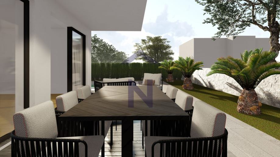 Iz dnevnog boravka se izlazi na veliku natkrivenu terasu i dvorišni dio koji s vanjske strane ima ljetnu kuhinju.