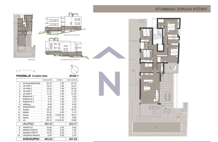 S1 - apartment with a total net area of 227m2 spreads across the entire floor. It consists of a living room with dining area and kitchen with access to a terrace with sun deck and pool, utility room, 5 bedrooms and 3 bathrooms (two bedrooms have their own bathrooms). The master bedroom has access to its own balcony. It also includes a yard, totaling 404m2. In the yard there is a large terrace with sea view, covered with a pergola, and a 13x3 m pool with heating and cooling. The apartment includes 2 garage parking spaces, one outdoor parking space, and a storage room of 20m2. Heating is underfloor via heat pump, and each room has a split AC unit for heating and cooling. The apartment will also be furnished. - 917.000,00 EUR