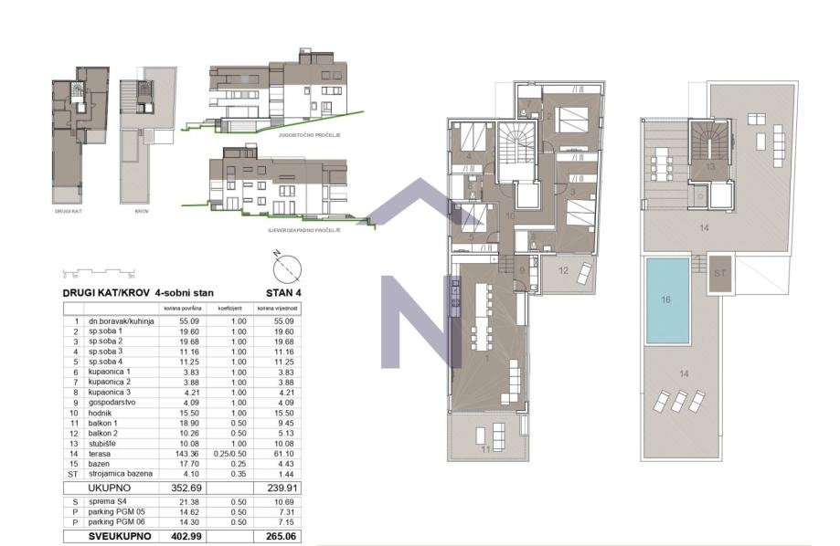 S4 - Penthouse with a total net area of 265m2 spreads across the entire second floor and rooftop terrace, and the total usable area of the apartment is 404m2. It consists of a living room with dining area, kitchen, utility room, 4 bedrooms, 3 bathrooms, and two terraces with sea view. Heating is underfloor via heat pump, and each room is equipped with a split AC unit for heating and cooling. On the rooftop terrace with panoramic sea view there is a lounge area with preparation for a home cinema, a kitchen and dining area covered with a pergola, sun deck, and an infinity heated and cooled pool 6x3 m. - 1.325.000,00 EUR