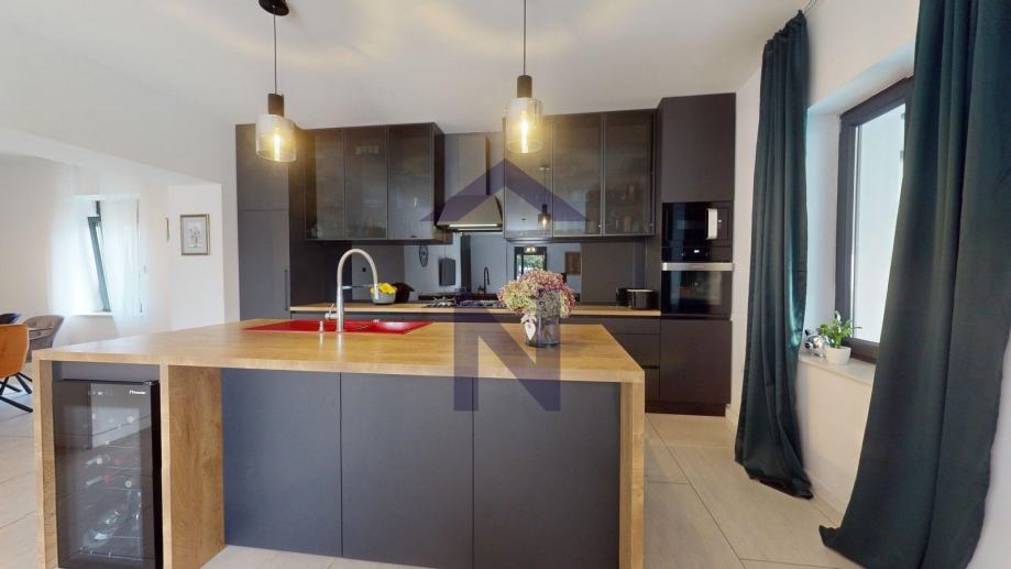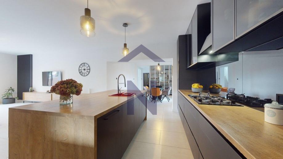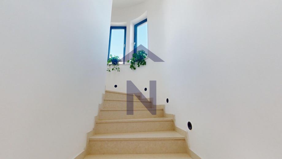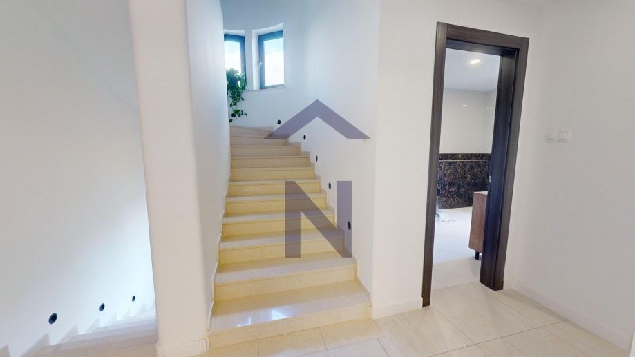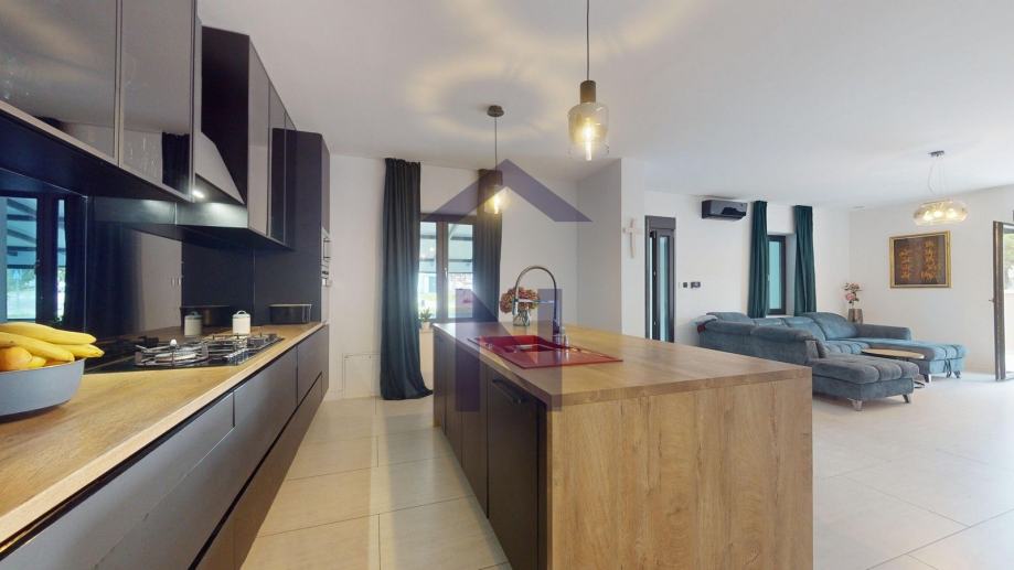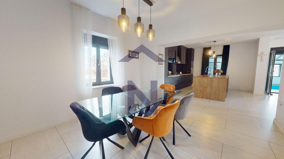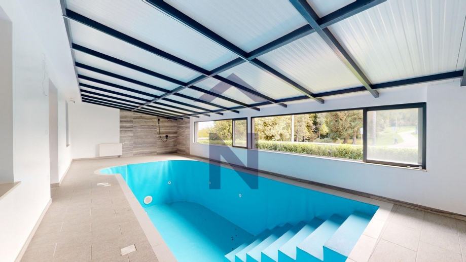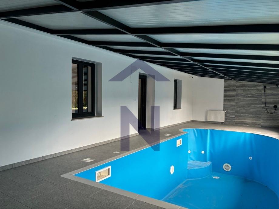 Prizemlje: ulazni hodnik, open space dnevni boravka s kuhinjom i blagovaonicom, izlaz na terasu i zatvoreni bazen, balkon, kupaonica i dodatni wc + poslovni prostor 20 m2 s odvojenim ulazom i terasom.