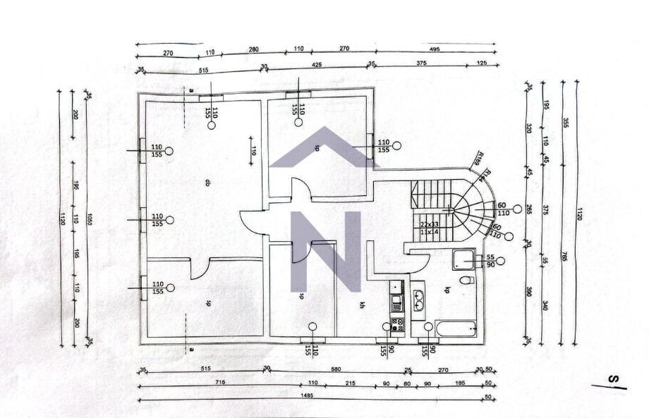 1. kat: 4 spavaće sobe, kuhinja i kupaonica.
