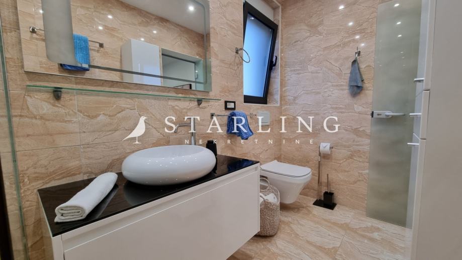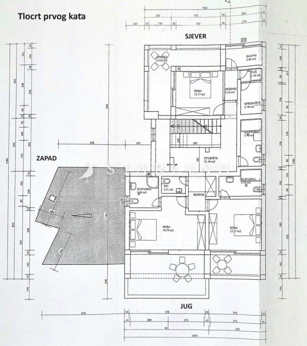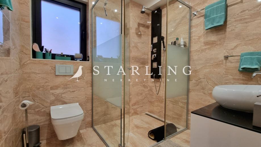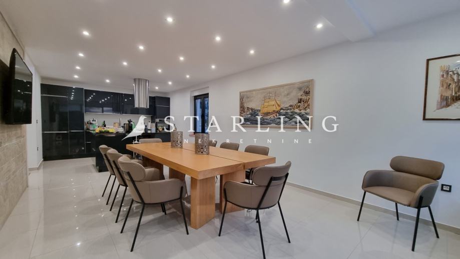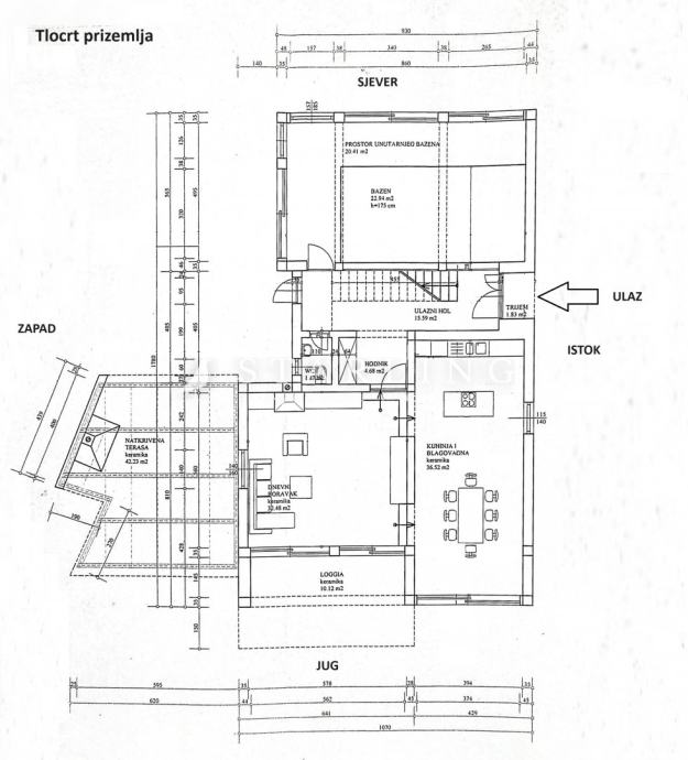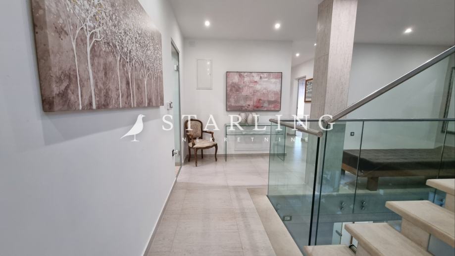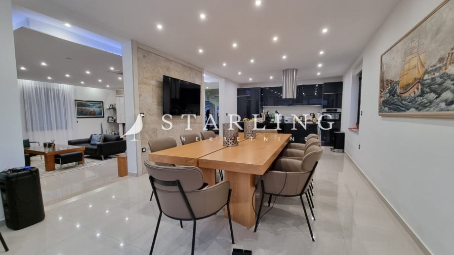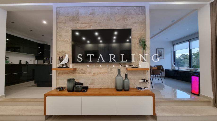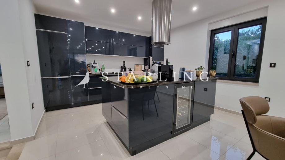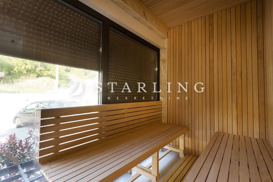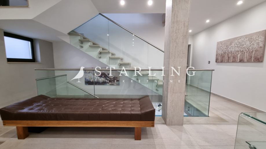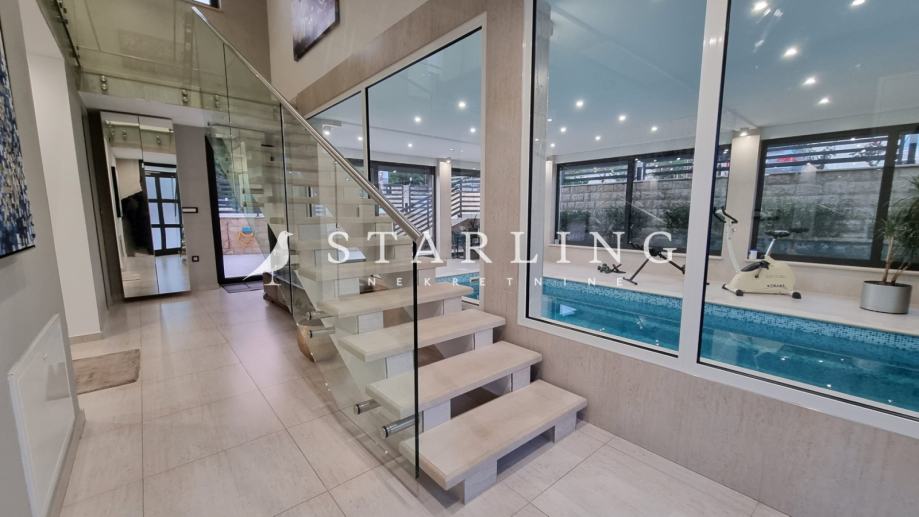 - PRIZEMLJA površine 182 m2: dnevni boravak s izlazom na loggiu, prostrana kuhinja s blagovaonicom, gostinjski WC te welness prostor sa spravama za vježbanje i grijanim unutarnjim bazenom površine 23 m2.