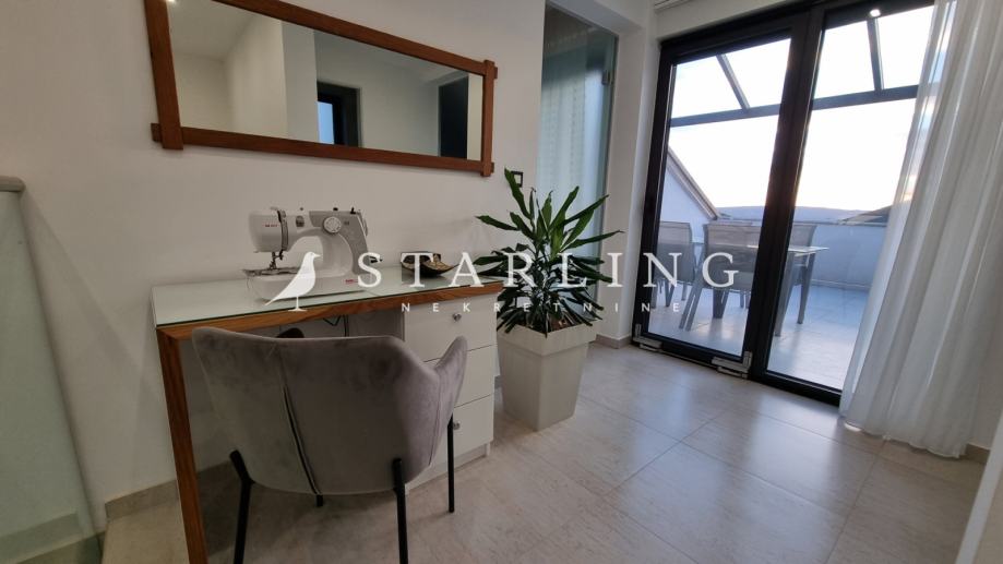 - POTKROVLJA površine 76 m2: spavaća soba s kupaonicom, studio s vlastitom kuhinjom i WC-om. Spavaća soba i studio imaju izlaz na natkrivenu terasu.