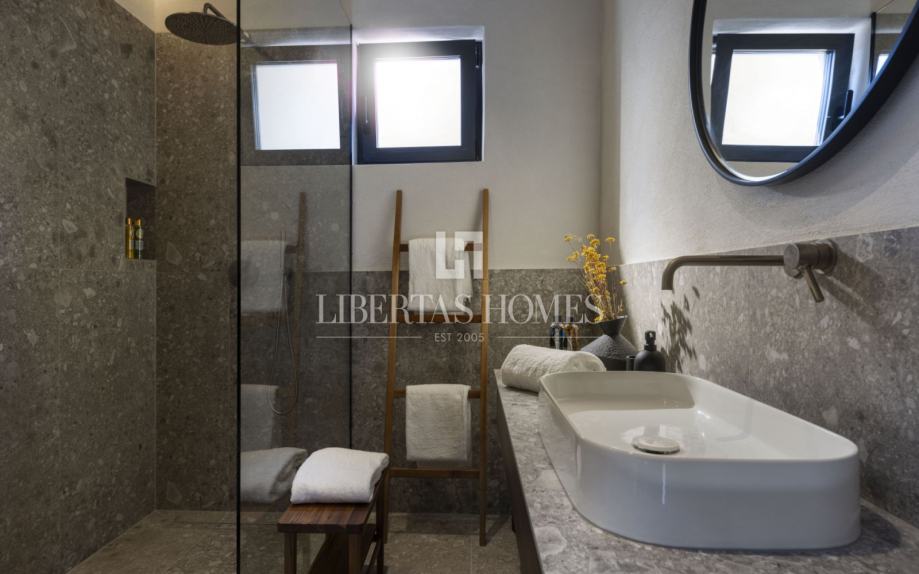 Svaka prostorija ima izlaz na veliku terasu koja dominira cijelim posjedom, s grijanim bazenom površine 40 m2 i sunčalištem, idealnim za opuštanje i uživanje u mediteranskoj klimi. Ovaj ekskluzivni posjed pruža potpuni mir i privatnost, a istovremeno se nalazi u neposrednoj blizini plaže i mora, stvarajući savršeno okruženje za luksuzni život u harmoniji s prirodom.