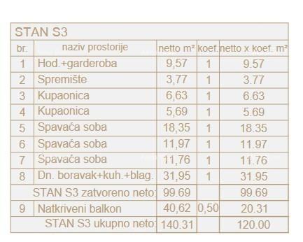 Stan S3, nalazi se na 1.katu zgrade A, površine 141.31 m2 (neto površine 120 m2) i sastoji od: hodnika s garderobom, spremišta, 3 spavaće sobe, 2 kupaone, dnevnog boravka s kuhinjom i blagovaonom te prostranog naktrivenog balkona kojem se pristupa iz svih soba, te s kojeg se pruža pogled na more.