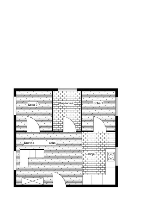 - Sastav: Dnevna soba, kuhinja, 2 spavaće sobe, hodnik, terasa/balkon