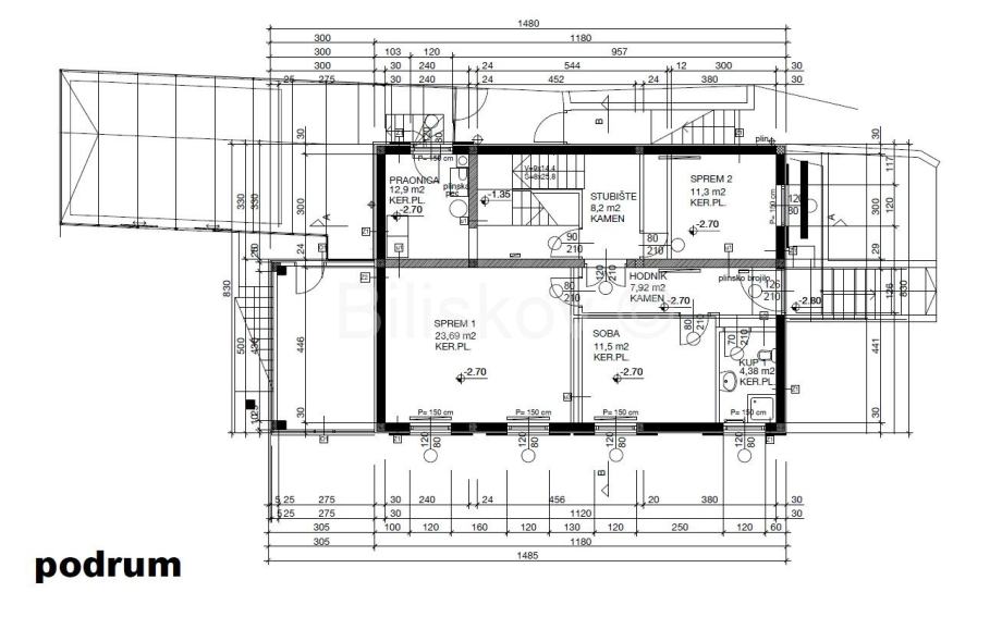 U podrumu vile nalaze se dva spremišta, soba, praonica te kupaonica.