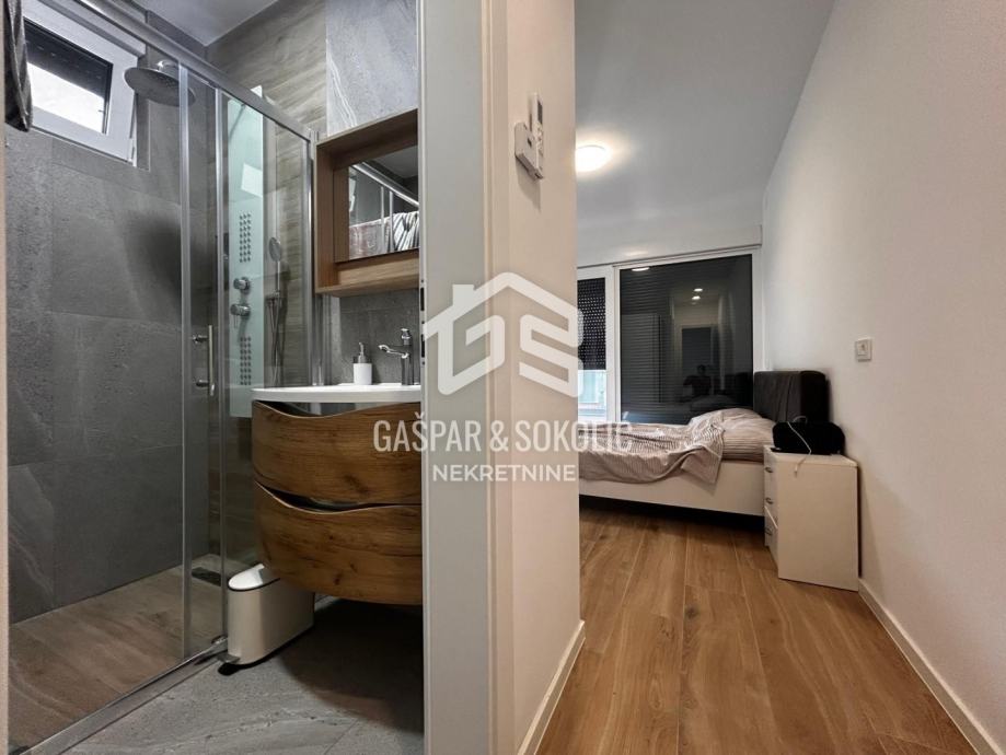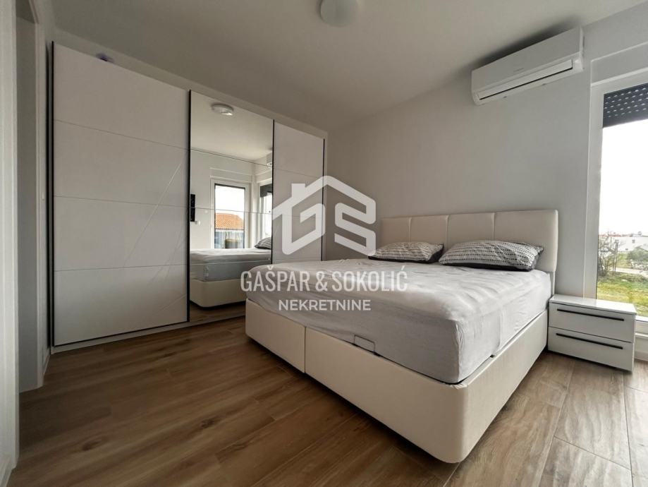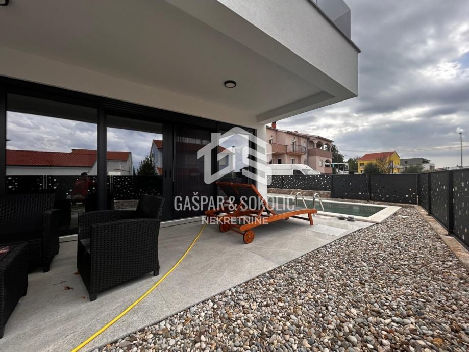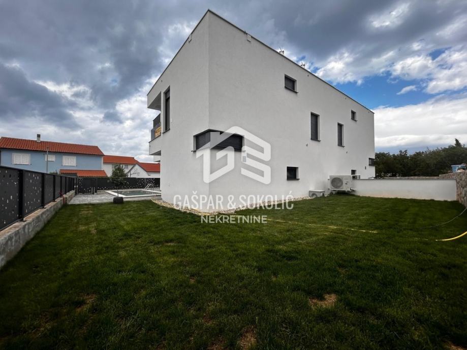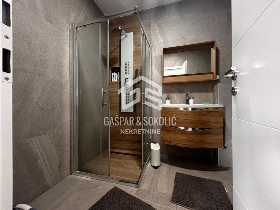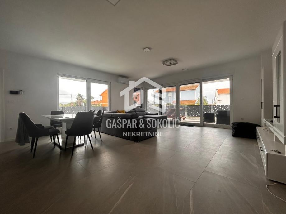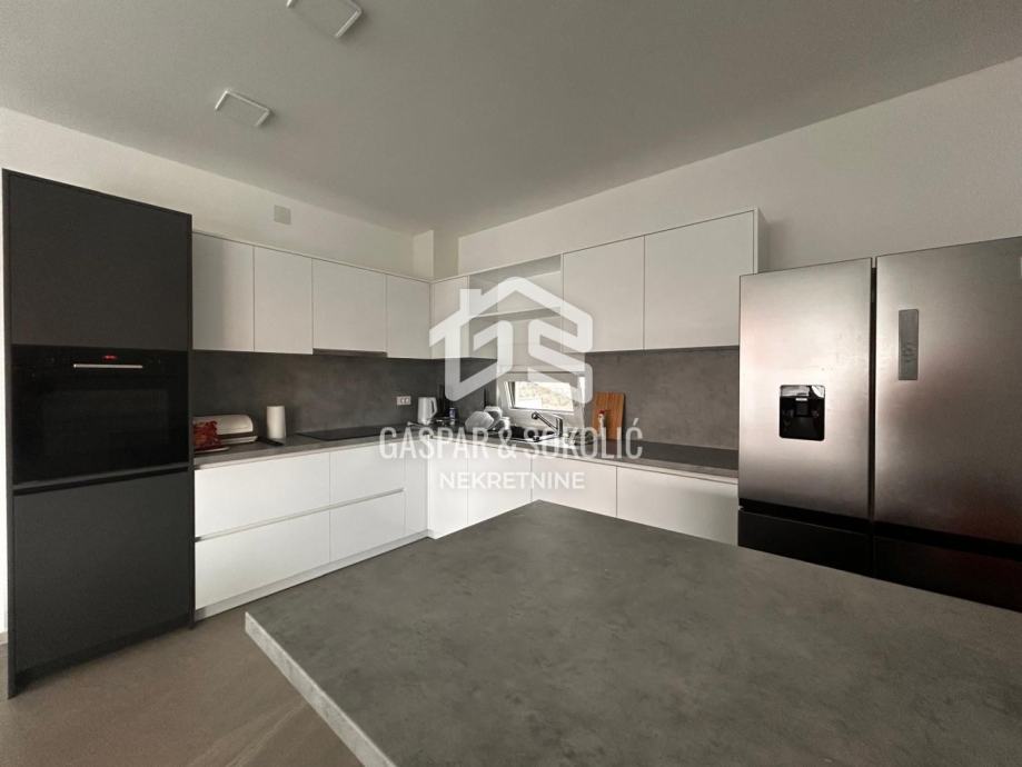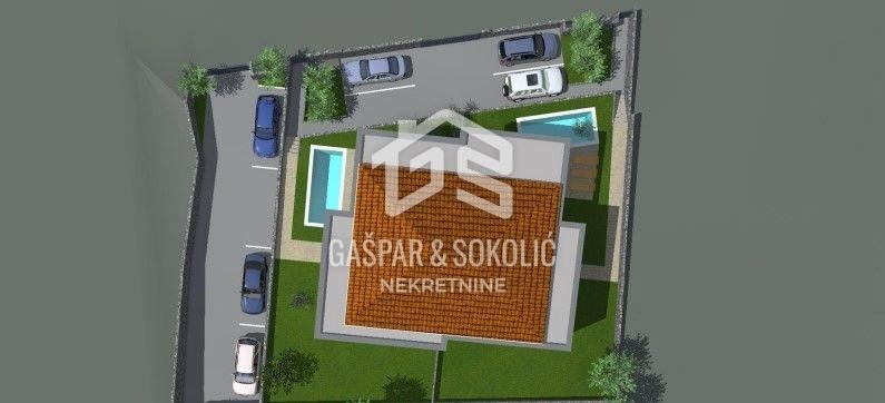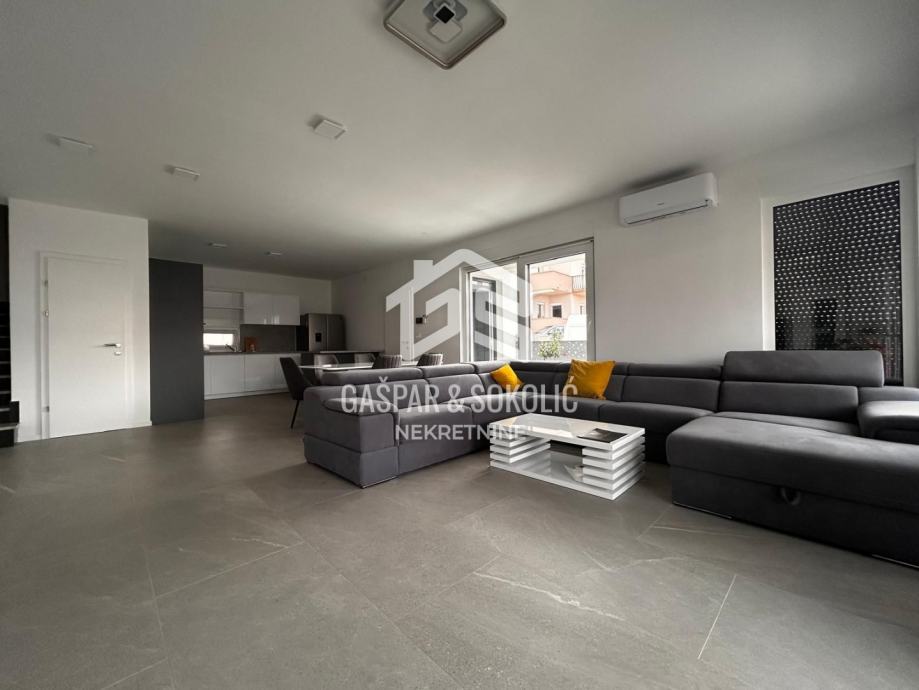 Donja etaža kuće očarava prostranim i svijetlim dnevnim boravkom koji se skladno stapa s modernom kuhinjom i elegantnom blagovaonicom, stvarajući savršen prostor za opuštanje i druženje. Iz ovog predivnog prostora izlazi se na prostranu terasu, koja poziva na uživanje u suncu i svježem zraku. Na gornjoj etaži smještene su spavaće sobe, svaka s izlazom na balkon, gdje se može uživati u miru i pogledu na okolnu prirodu.