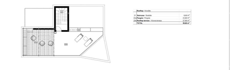 Na krovu vile nalazi se predivno uređena terasa (27,90 m²) s pergolom (23,90 m²), koja pruža ekskluzivan prostor za objedovanje na otvorenom, sunčanje ili opuštanje uz prekrasan pogled.
