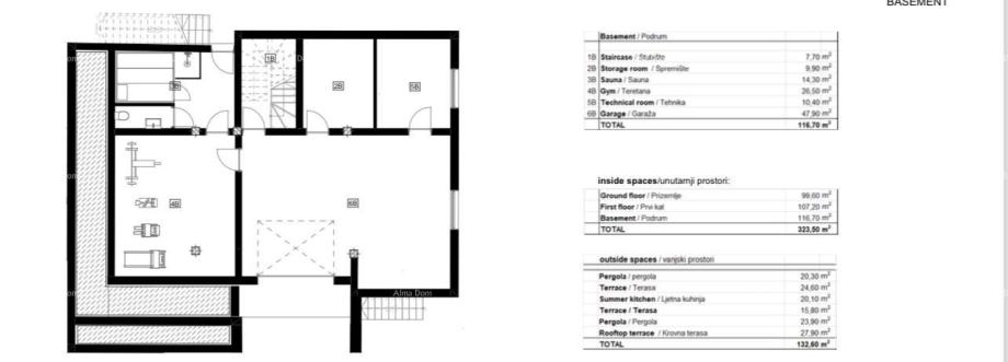 Podrum nudi različite funkcionalne prostore, uključujući teretanu (26,50 m²), saunu (14,30 m²) i veliku garažu (47,90 m²). Također se nalazi tehnička soba (11,60 m²) i dodatni prostor za pohranu.