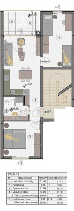 Stan A3, površine 56.66 m2 (neto površine 55 m2) se nalazi na 1.katu stambene zgrade A i sastoji se od ulaznog hodnika, dnevnog boravka, blagovaone i kuhinje, 2 spavaće sobe, kupaone i natkrivene terase.