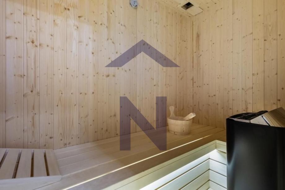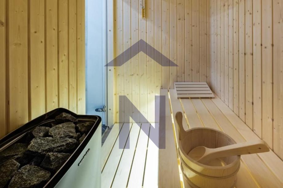 The total area of the apartment is 61.84m2, and it consists of a hallway, kitchen, living room, one bedroom, and a bathroom.The apartment features a jacuzzi and sauna.