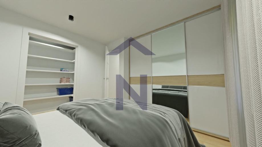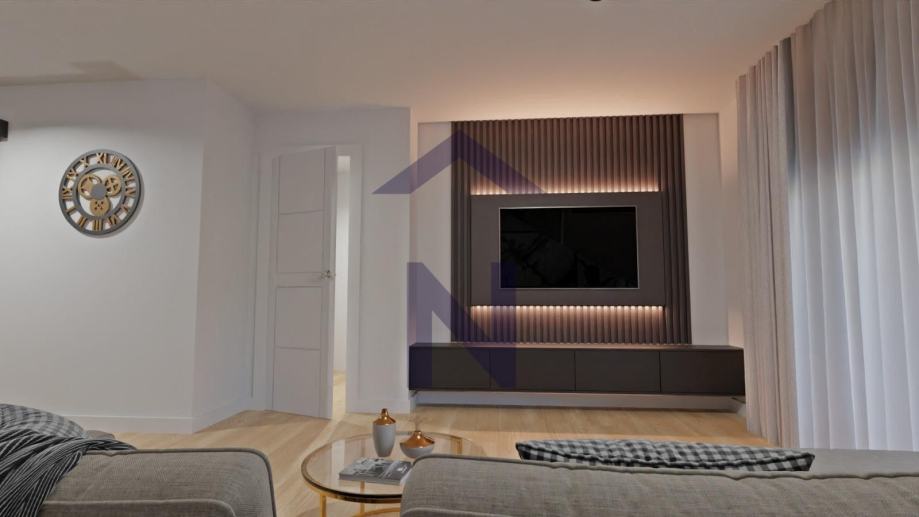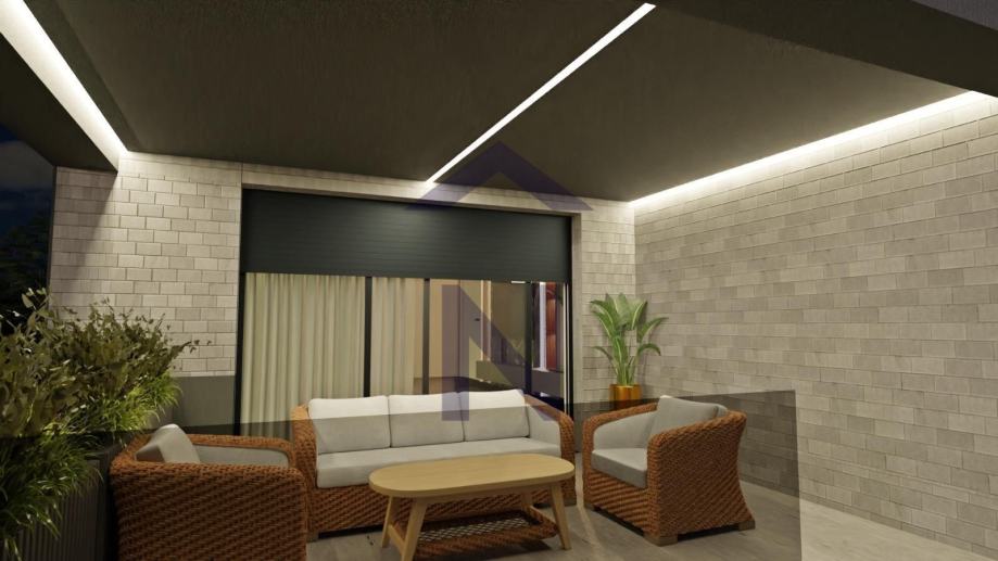 Sastoji se od dnevnog boravka, blagavaonice s kuhinjom, hodnika, 2 spavaće sobe, 2 kupaonice, toaleta, spremišta, terase i vrta od gotovo 100 m2 + VPM 18 m2 + parkirno mjesto u garaži 19,02 m2 = ukupna cijena 763.750,00 EUR