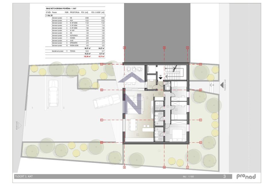 S2 - 1. kat neto površine ukupno 107,75m 2 = stambena površina iznosi 93,74 m2 x 4.700 €/m2Sastoji se od dnevnog boravka, kuhinje , hodnika, radne sobe, 3 spavaće sobe, 2 kupaonice, toaleta, spremišta i terase + VPM 18 m2 (4,5 m2, računato po koeficijentu 0,25) + parkirno mjesto u garaži 19,02 m2 ( 9,51 m2, računato po koeficijentu 0,5) =506.425,00 EUR + 10.000,00 EUR spremište= ukupna cijena 516.425,00 EUR