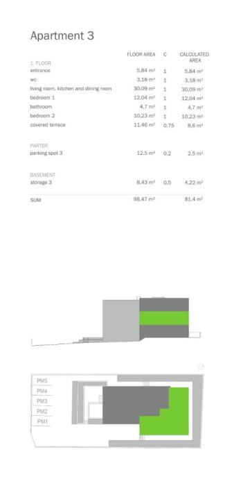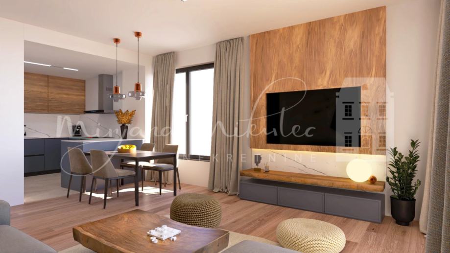 Ovaj prekrasan trosobni apartman svjetlog, otvorenog rasporeda, uz eleganciju i stil s profinjenim završnim detaljima, stvara ugodnu i funkcionalnu atmosferu doma. Apartman je zatvorene stambene površine 68.55 m2, dok sa terasom, parkirnim mjestom i spremištem obračunski iznosi 81.40 m2.