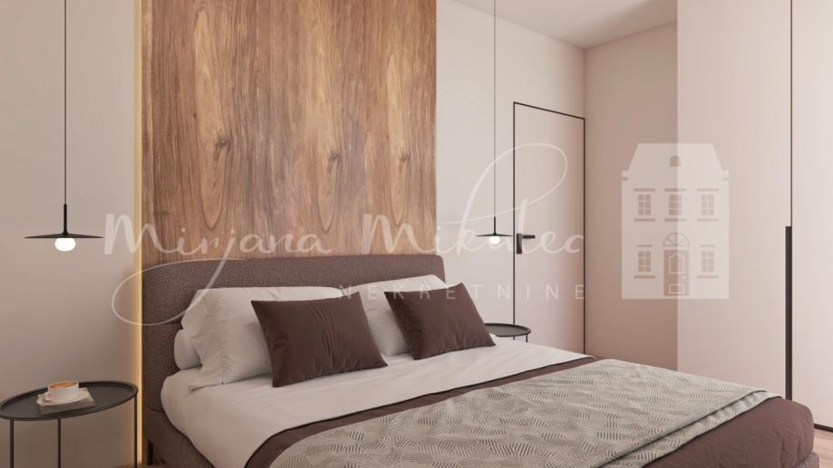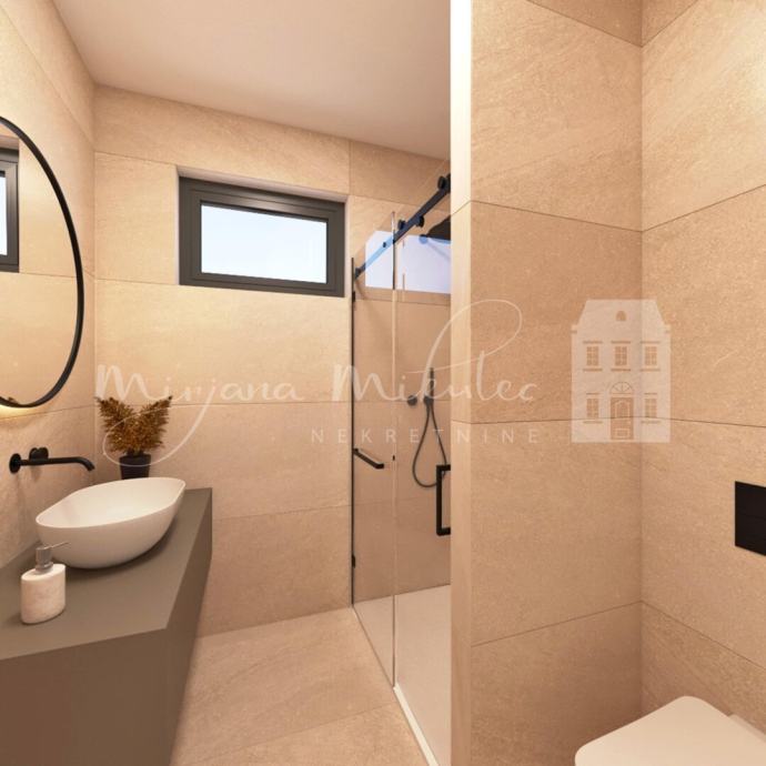 Apartman se nalazi na prvom katu a sastoji od open space dnevnog boravka, kuhinje, blagovaonice sa prekrasnom terasom s pogledom na more. Tu su i dvije prostrane spavaće sobe, kupaonica s toaletom te dodatni gostinski toalet.