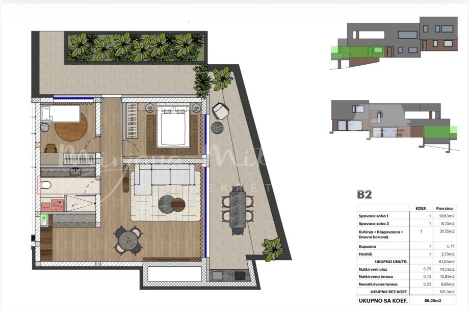 Stan B2- nalazi se u prizemlju, natkriveni ulaz ( 14.51 m2), zatvorenog stambenog prostora ima 61.03 m2, i čine ga: 2 spavaće sobe, kupaona te dnevni dio otvorenog koncepta ( 31.75 m2) iz kojeg se izlazi na natkrivenu terasu 15.81 m2 te nenatkriveni dio terase ( 9.95 m2).