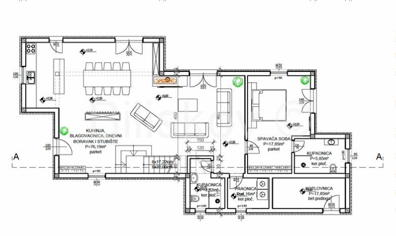 U prizemlju se nalazi stubište, kuhinja, blagovaonica i dnevni boravak (76,19 m2), spavaća soba (17,85 m2), dvije kupaonica (4,82 i 5,85 m2), praonica (4,16 m2) , kotlovnica (17,85m2).