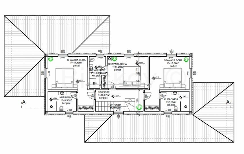 Na prvom katu se nalazi stubište koje zauzima 10,67 m2, tri spavaće sobe (14,29, 17,07, 17,40) sa tri kupaonice (5, 95, 4,63 i 5,95 m2 ).