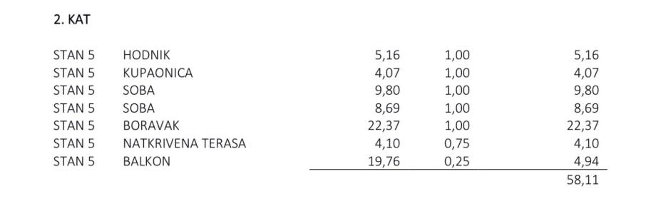 Ovaj prostrani trosobni apartman smješten je na 2. katu zgrade. Sastoji se od dnevnog boravka s kuhinjom i blagavaonicom (22,37 m²), kupaonice s WC-om (4,07 m²), hodnika (5,16 m²), dvije spavaće sobe (9,80 i 8,69 m²), natkrivene terase (4,10 m²) i balkona (19,76 m²).