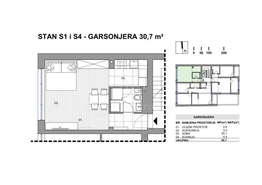 U prodaji je garsonijera u novogradnji, površine 30,70 m², smještena u manjoj zgradi s ukupno osam stanova, na vrlo mirnoj i ugodnoj lokaciji. Predviđen završetak gradnje je ljeto 2026. godine.