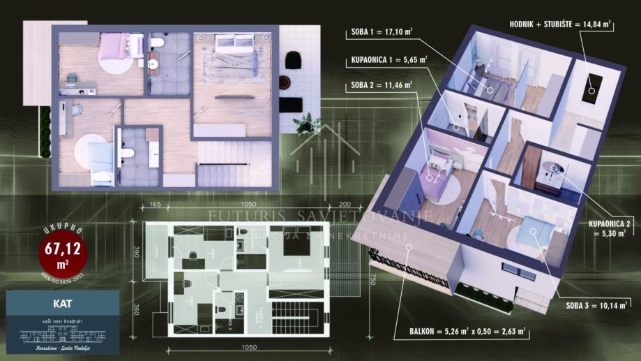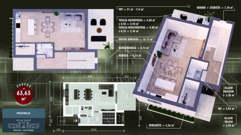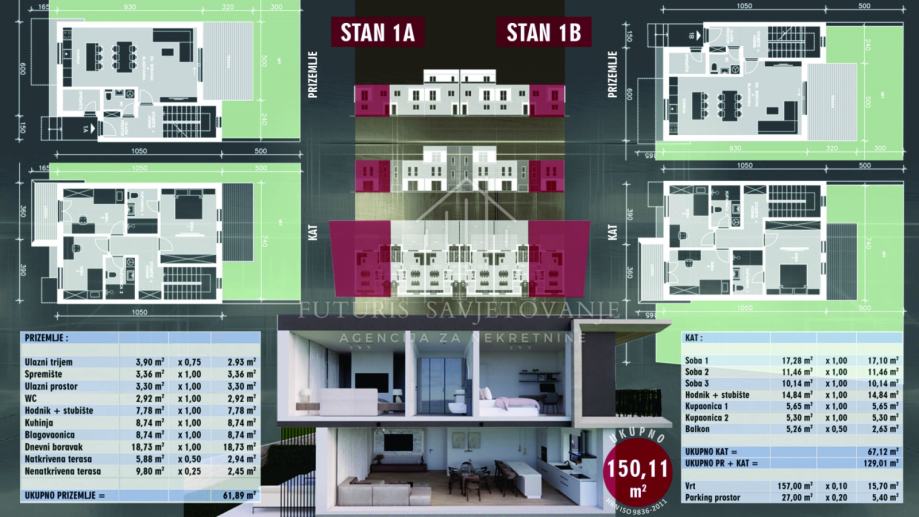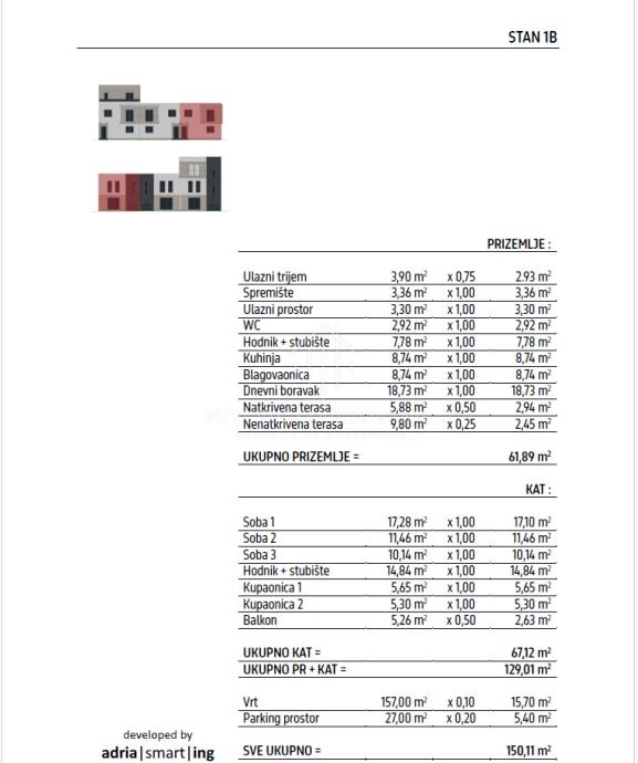 kupaonice, balkon, vrt i dva parkirna mjesta, UKUPNA KVADRATURA: 150,11 m2.