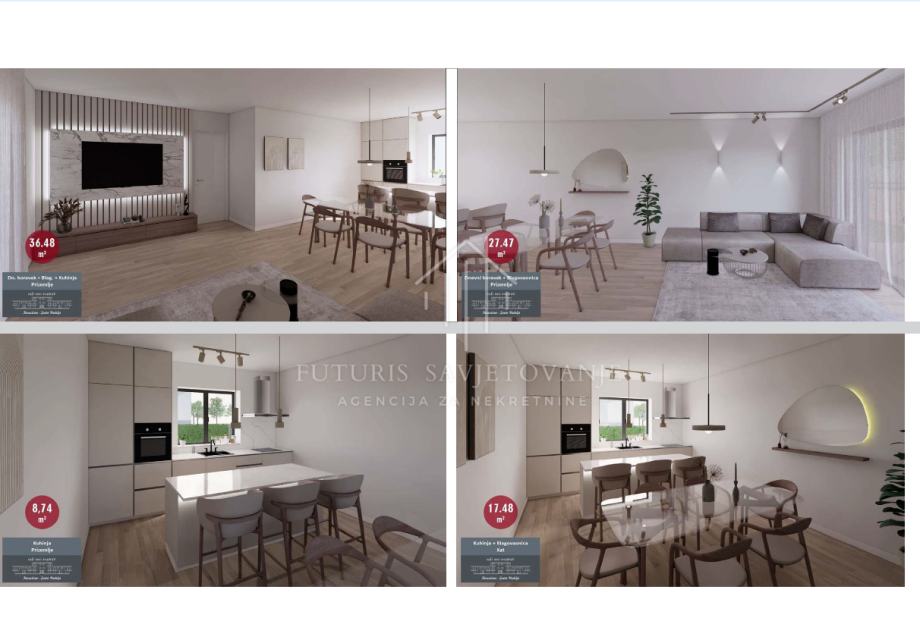Zgrada se sastoji od prizemlja, prvog kata i potkrovlja, s ukupno šest odvojenih stanova različitih kvadratura. Svaki stan ima svoj zaseban ulaz, osigurana 2 parkirna mjesta te pripadajući vanjski prostor – terasa, balkon ili dio dvorišta, ovisno o položaju unutar objekta. Građeno je kvalitetnim materijalima, uz pažnju na detalje i funkcionalnost prostora.