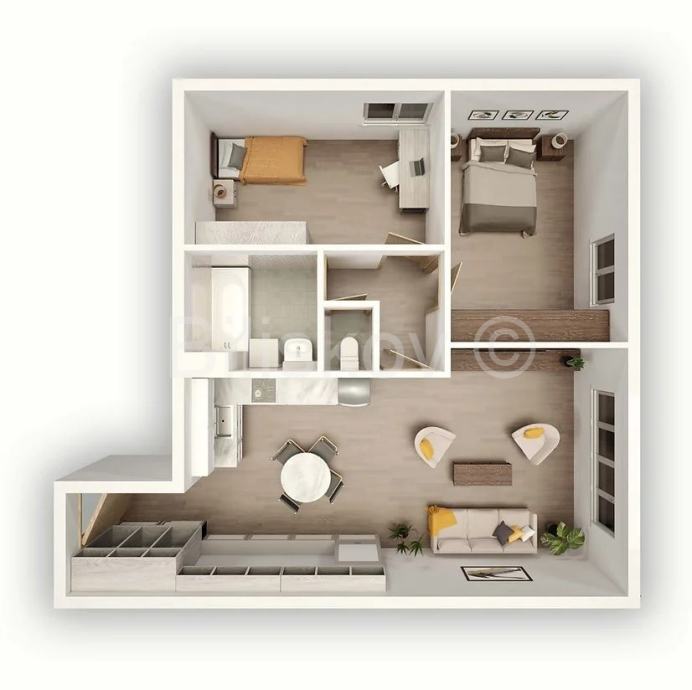 Stan se sastoji od dvije spavaće sobe, dnevnog boravka, kuhinje s blagovaonicom, kupaonice s wc-om, i jednog parking mjesta na etaži -1 veličine 12,50 m2.