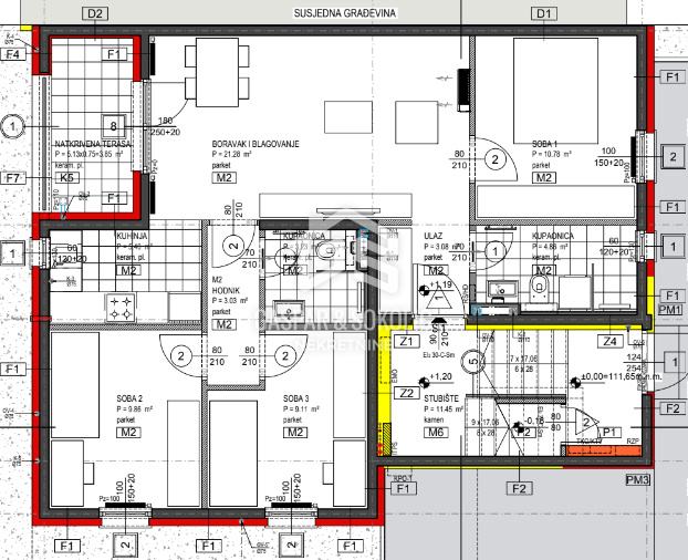 Prodaje se stan u novogradnji s planiranim završetkom radova u 2024. godini. Smješten je na visokom prizemlju zgrade s dva kata. Stan se sastoji od ulaznog prostora, tri spavaće sobe, open space dnevnog boravka, loggie i dvije kupaonice. Ukupna obračunska površina iznosi 88,5 m², od čega je 78 m² stambenog prostora. Stanu pripada i vrt stvarne površine 75 m² (obračunski 7,5 m²), vanjsko parkirno mjesto (obračunski 3 m²) te garaža (obračunski 10 m²). Orijentacija stana je sjeveroistok – jugozapad, što omogućuje odličnu prirodnu osvijetljenost.