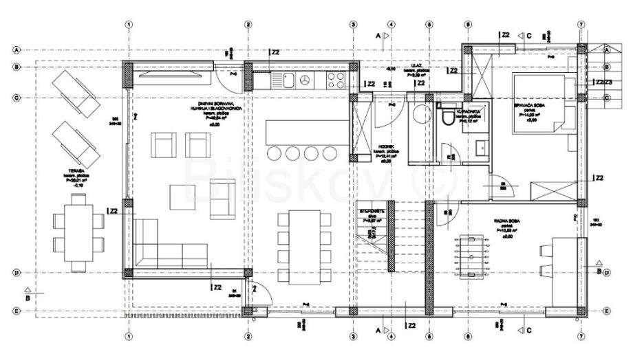U prizemlju se nalazi terasa, dnevni boravak s kuhinjom i blagovaonicom, kupaonica, spavaća soba i radna soba.