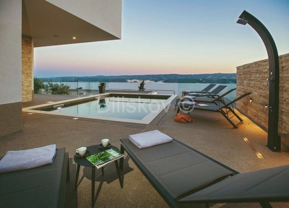 U prizemlju se nalaze kuhinja, blagovaonica, dnevni boravak, gostinjski wc, vinski bar te vanjski grijani bazen.