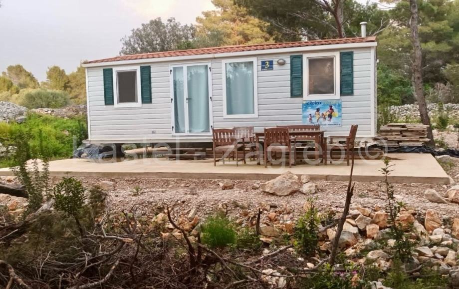 Prodaje se montažna kućica površine 32 m2 na otoku Šolti. Kućica se sastoji od dvije spavaće sobe, svaka soba ima vlastitu kupaonice te kuhinje i dnevnog boravka. Kućica je kompletno opremljena (kuhinjski aparati, tv, klima...).Nalazi se na predivnoj parceli od 8000 m2 na južnoj strani Šolte, udaljenoj svega par stotina metara od mora s koje se pruža spektakularan pogled na na more i prirodu.Na parceli se nalaze visoki borovi što omogućava oazu hlada uz kućicu i jedinstveni ugođaj i intimu. Okolo parcele su uređeni maslinici, a do parcele vodi široki uređeni put. Parcela je u poljoprivrednoj zoni.