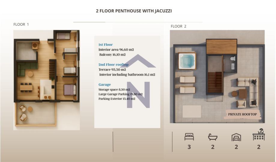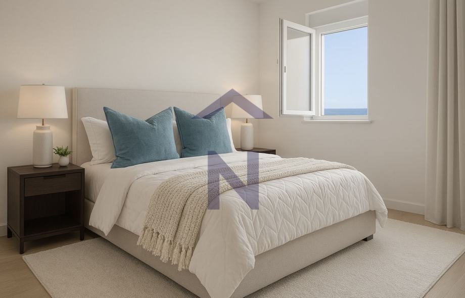 The apartment also has a covered loggia with a sea view, accessed from the living room, with an area of 16.10 m2 and an uncovered roof terrace with an area of 93.50 m2 with an open view of the sea and a jacuzzi.