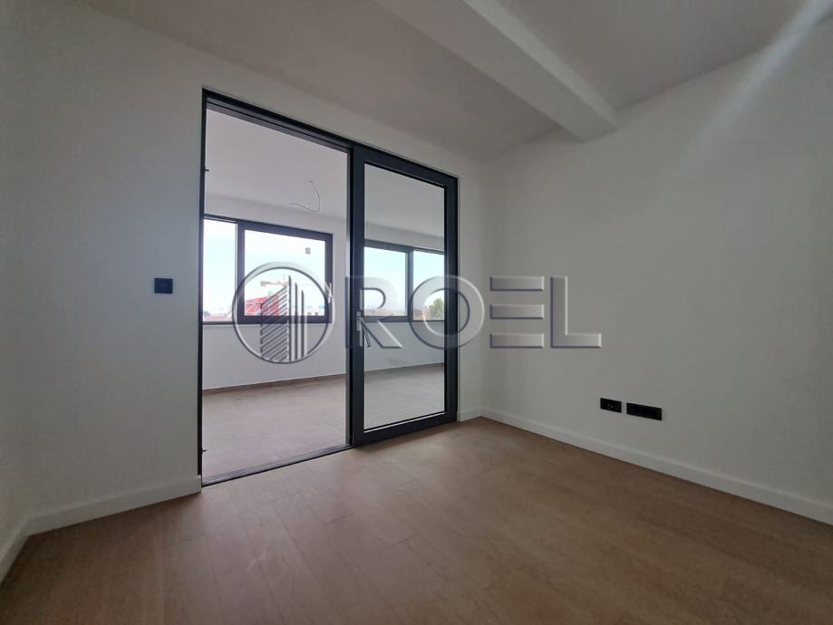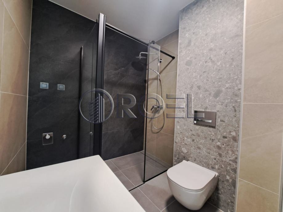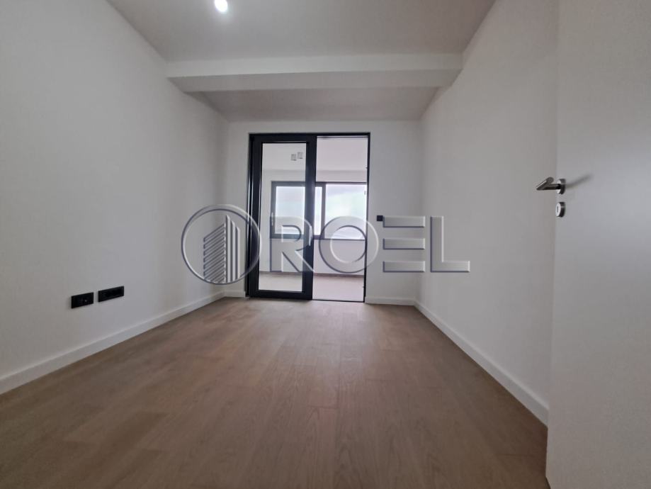 Podovi su obloženi kvalitetnim parketom i keramikom, a dodatnu razinu udobnosti pruža podno grijanje putem dizalica topline. Svaka soba opremljena je vlastitim termostatom za individualno podešavanje temperature, dok klima uređaj osigurava ugodnu temperaturu tijekom cijele godine. Stan je dodatno opremljen ALU stolarijom, električnim roletama i videoportafonom što jamči sigurnost, energetsku učinkovitost i suvremeni standard stanovanja.