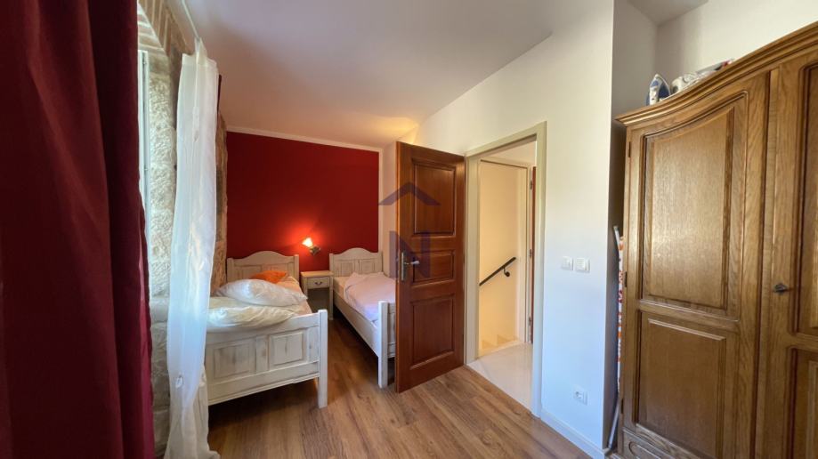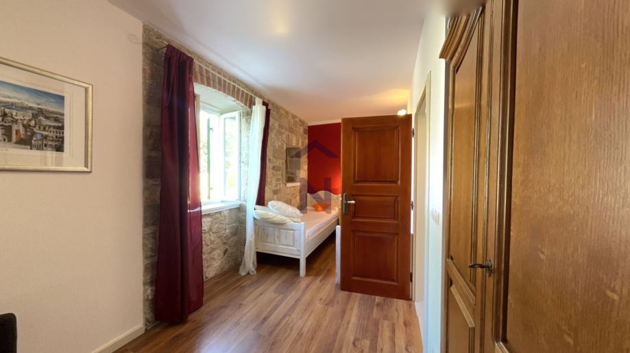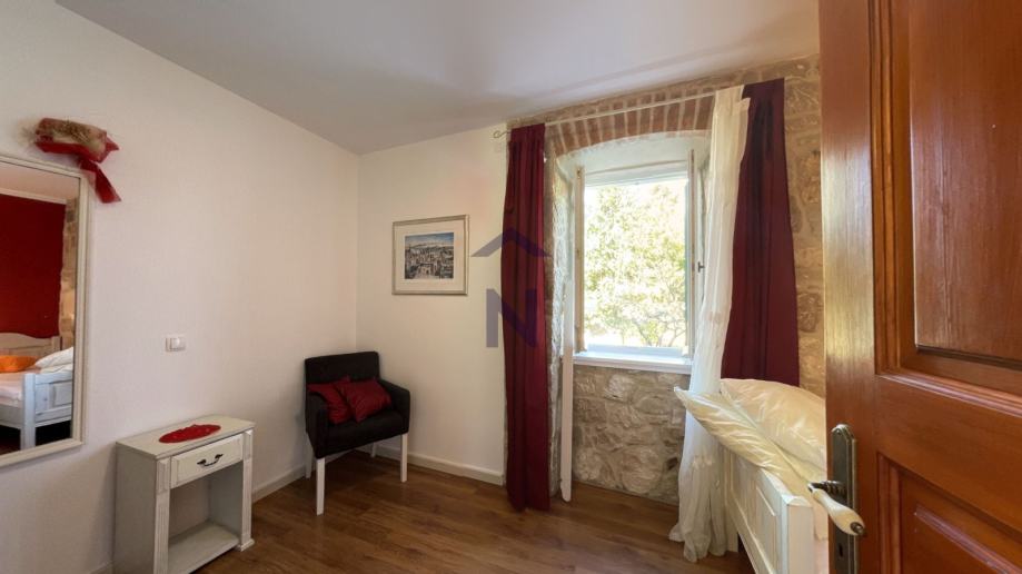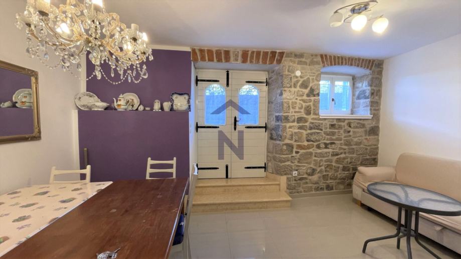 Kuća je adaptirana, uređenje je u dalmatinskom stilu, a kamen na kući je obrađen ručno i detaljno uz puno truda i vremena. Namještaj je izrađen od punog drveta.