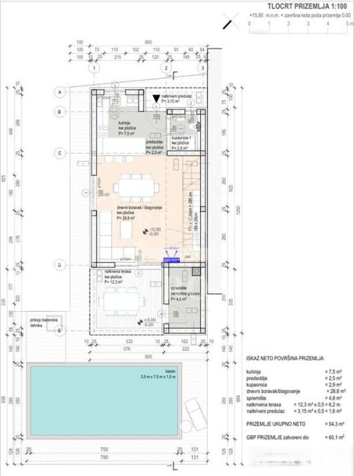 Projektirani bazen: 26,2 m², dimenzije 7,5 x 3,5 m, svijetla dubina 1,5 m